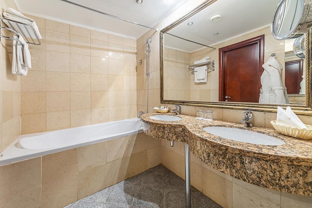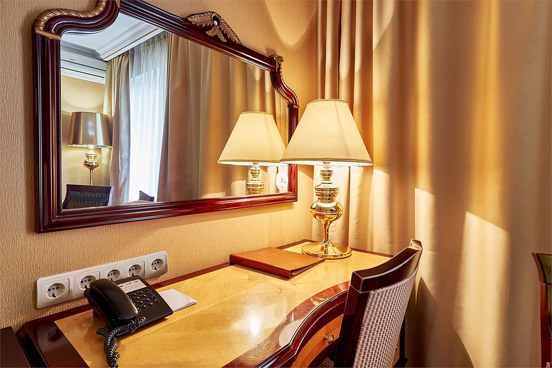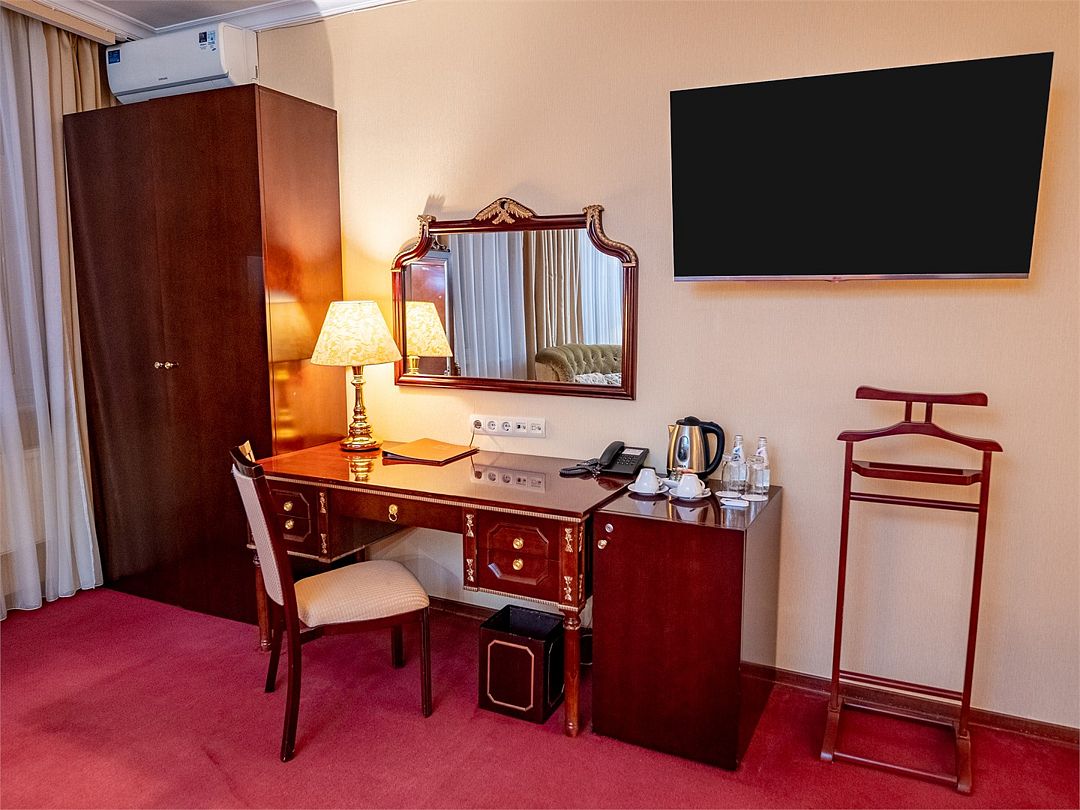 В номере — рабочая зона с удобным письменным столом, высокоскоростной Wi-Fi, индивидуальный сейф для ценных вещей и документов. Номера укомплектованы мини-баром, чайной станцией, телефоном, феном, гладильными принадлежностями и халатами.