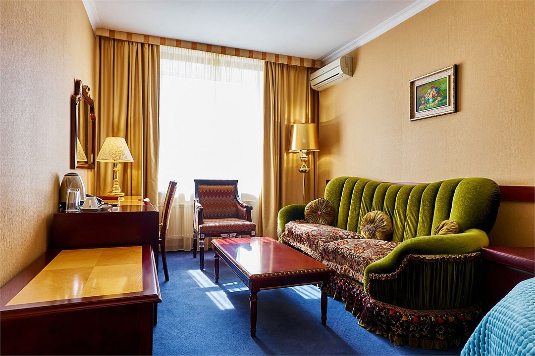 Интерьер выдержан в приятной теплой гамме, которая располагает к спокойному отдыху после насыщенного дня. Широкая двухместная кровать размера «King Size» гарантирует великолепный сон, а современная система климат-контроля обеспечит оптимальную температуру и максимальный уют в номере. В номере отдельно выделена гостиная зона с мягкой мебелью (диван, кресло) и журнальным столом к ней.