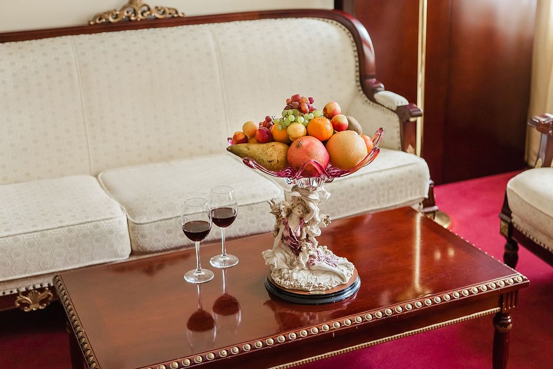 Интерьер выдержан в элегантных, золотисто-бежевых и винных оттенках, располагает к комфортному отдыху. В каждой из комнат номера выделена гостиная зона с креслами и кофейным столиком.