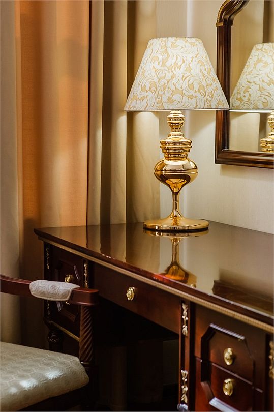 Теплые тона отделки дарят ощущение комфорта и способствуют расслаблению, мебель из ценных пород дерева выглядит изысканно и одновременно, солидно. Интерьер номера тщательно продуман, здесь есть все, что может понадобиться во время отдыха.