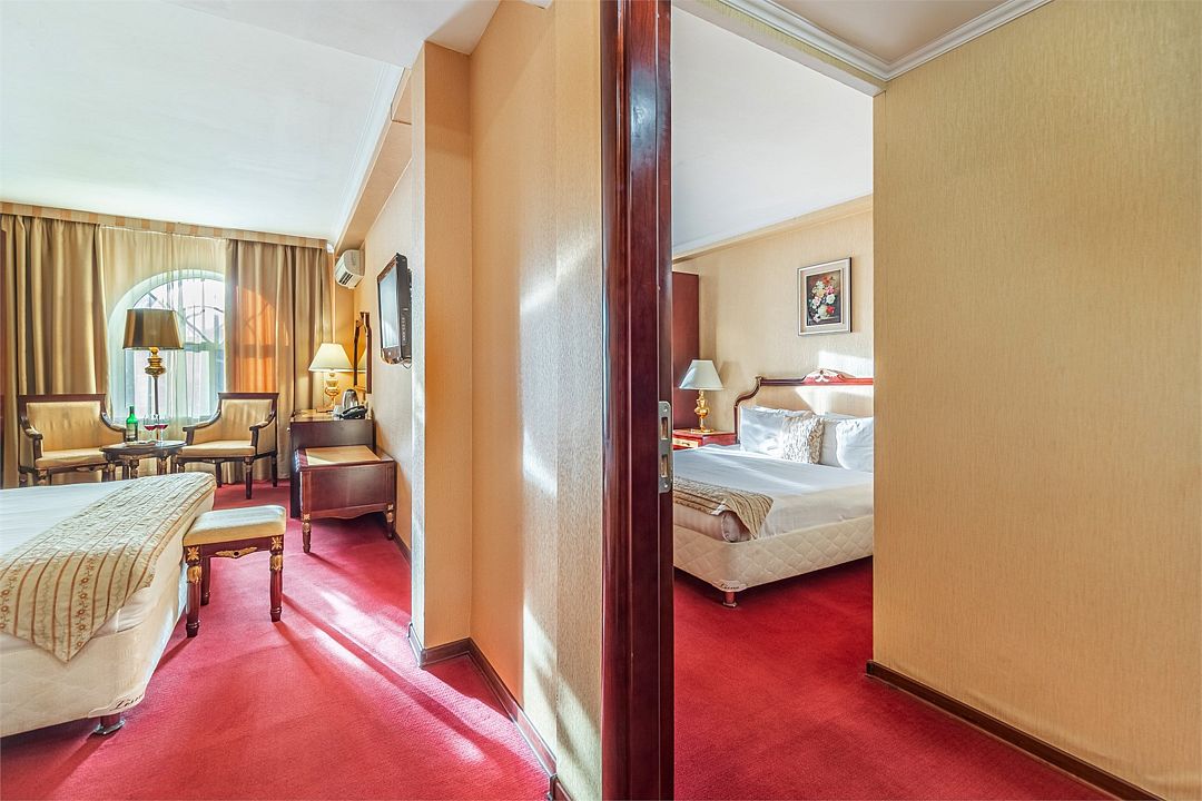 Просторный «семейный» номер с двумя изолированными комнатами со смежной дверью между ними, оснащенный комфортными кроватями размера «King size» — оптимальный вариант размещения для семьи с детьми или компании до шести человек.