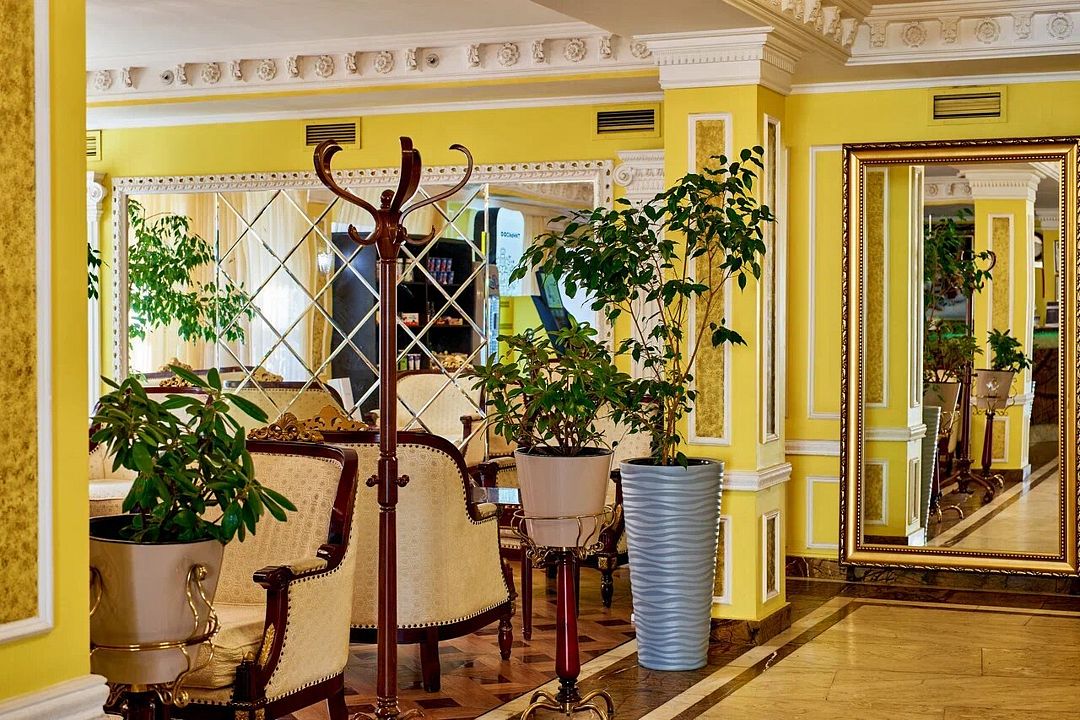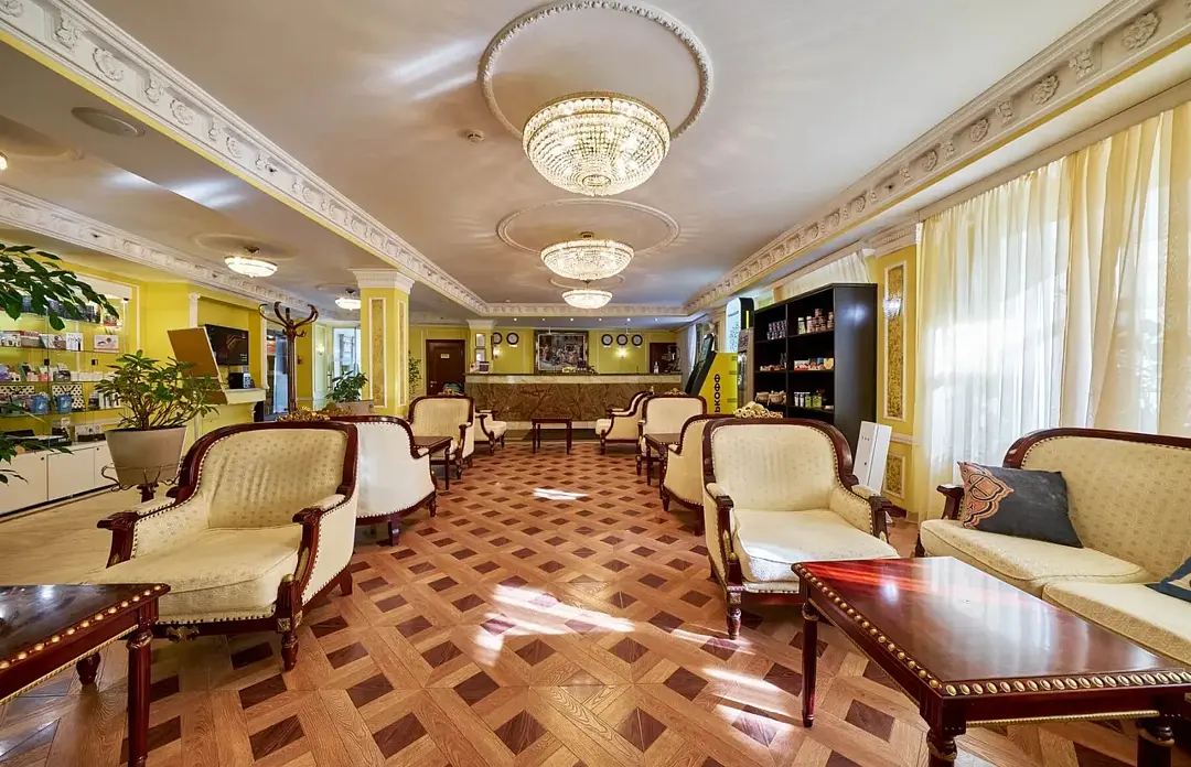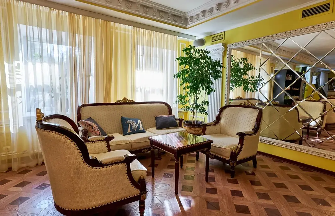 Лобби-бар отеля «Мандарин» — это стильное и уютное пространство, где гости могут насладиться атмосферой заботы и комфорта. Современный дизайн и мягкая мебель создают идеальные условия для встреч, выставок и фотосессий, а зеркальная стена и элегантные элементы интерьера визуально расширяют пространство.