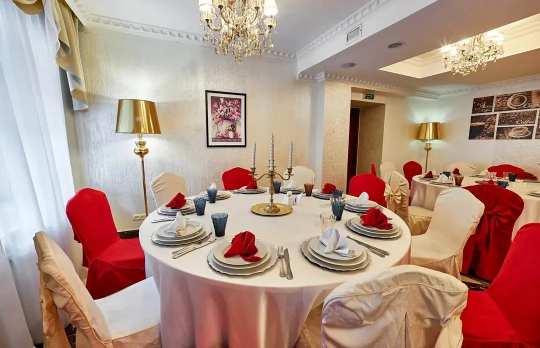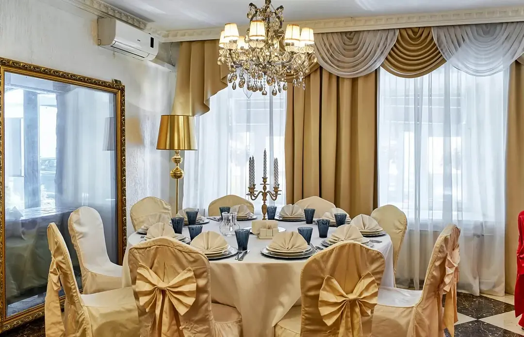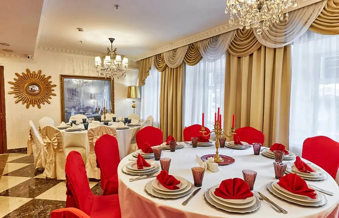 Банкетный зал «Наполеон» — элегантное пространство для особенных событий. Роскошный декор с золотыми элементами и винтажными люстрами создает уникальную атмосферу, а панорамные окна наполняют помещение естественным светом и открывают живописный вид. Идеален для свадеб, банкетов, фуршетов и памятных торжеств.