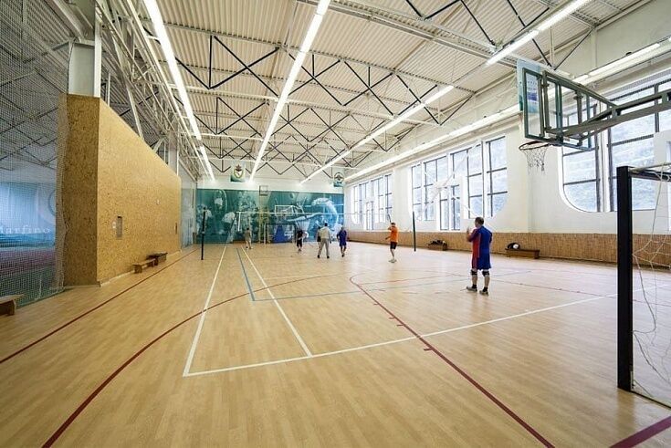 Читать полностьюПлощадь спортивного игрового зала 18х30 м, высота 6 м. В зале проводятся игры в волейбол, баскетбол, бадминтон. По периметру зала установлены столы для игры в настольный теннис (3 стола).