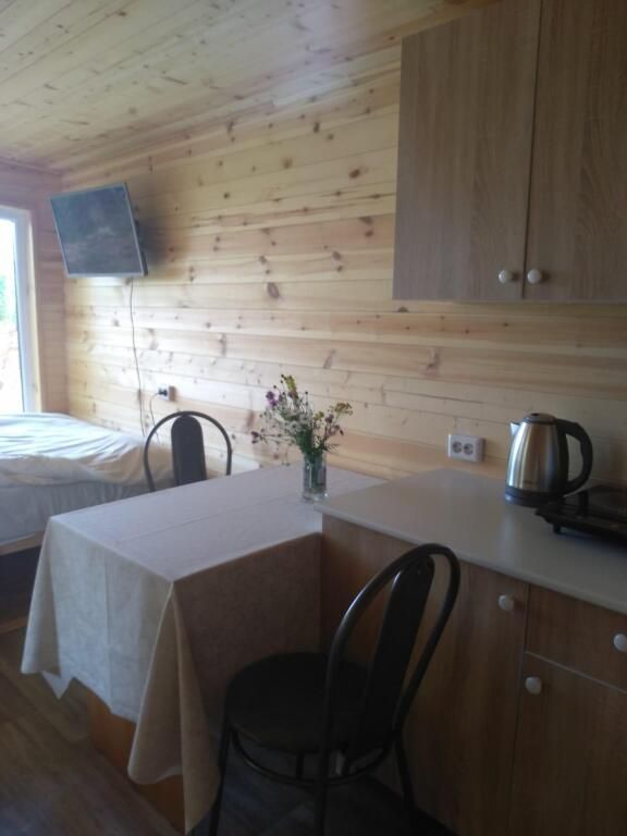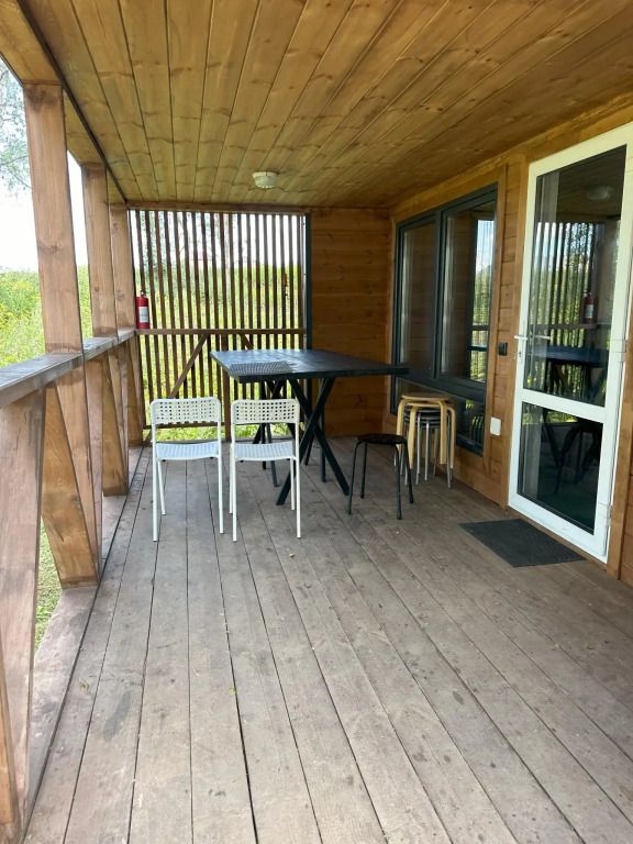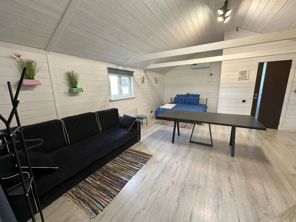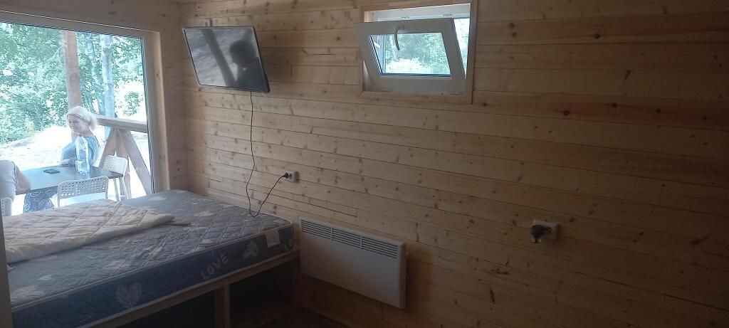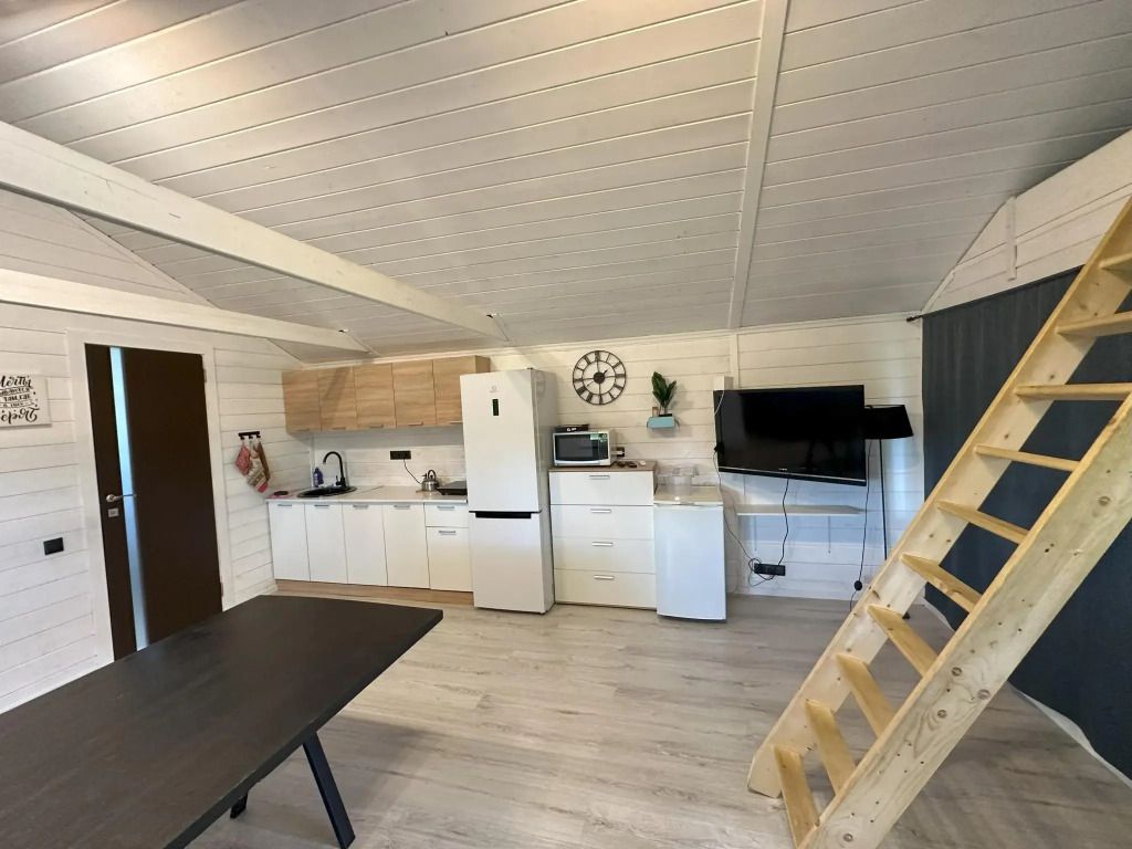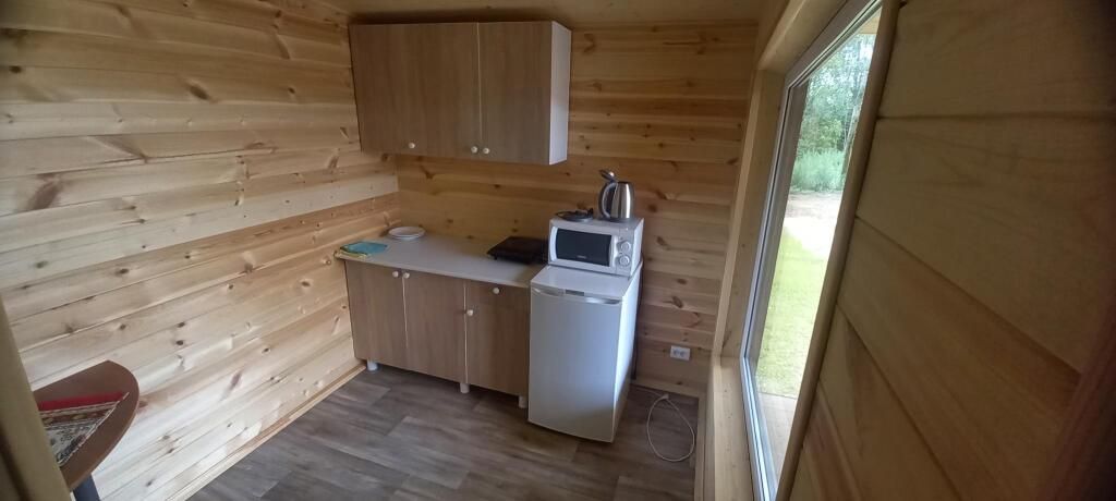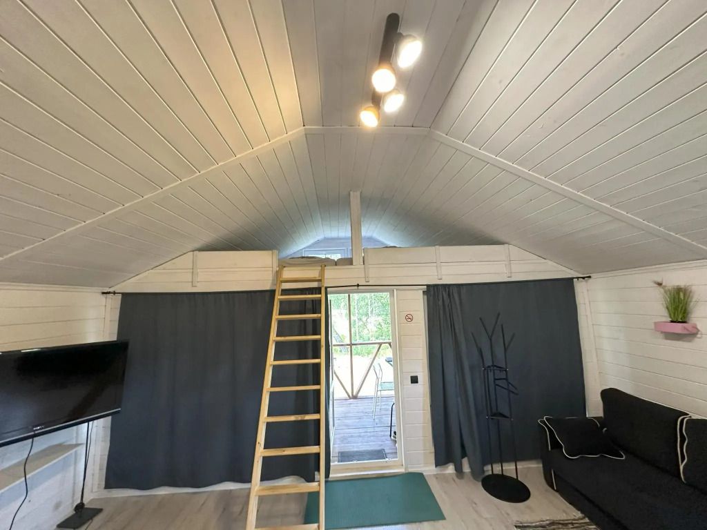 Дом № 6 площадью 40 кв.м, где комфортно разместиться 4 взрослых человека, а также есть мансардный этаж с матрасами, где могут разместиться ещё 2 взрослых человека или трое детей.