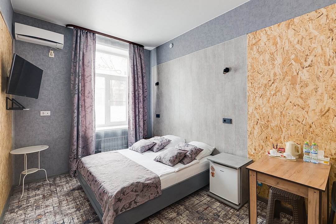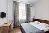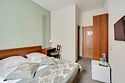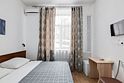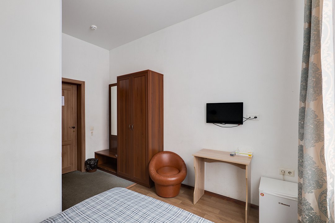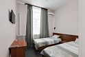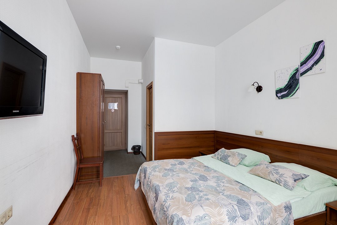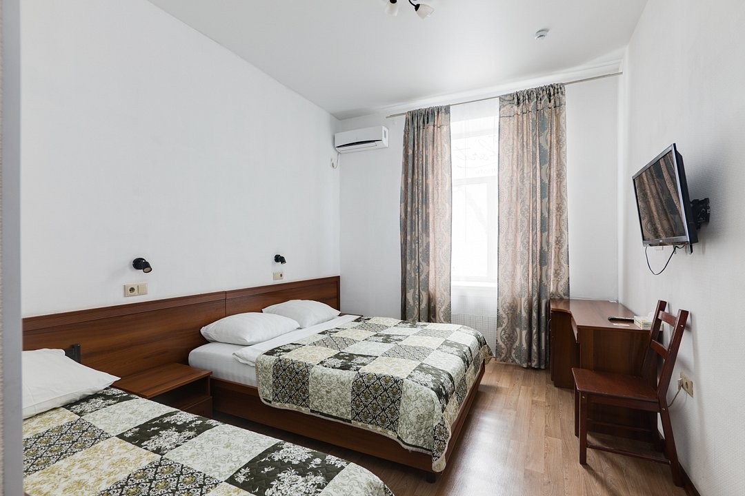 Современный и уютный номер, предназначенный для размещения одного, двух или трех человек. Письменный стол и один стул, бра, платяной шкаф, две прикроватные тумбочки, подставка для багажа, зеркало в полный рост, мини-холодильник, сейф, телевизор, душевая кабина, фен, тапочки, комплект полотенец, гель для душа, шампунь, мыло.