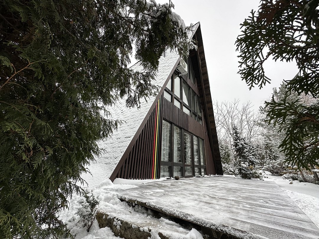 Треугольное шале выполнено в современным дизайнерском стиле, вмещает до 8 человек под проживание.