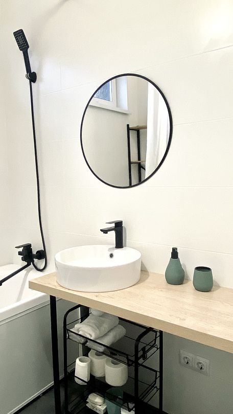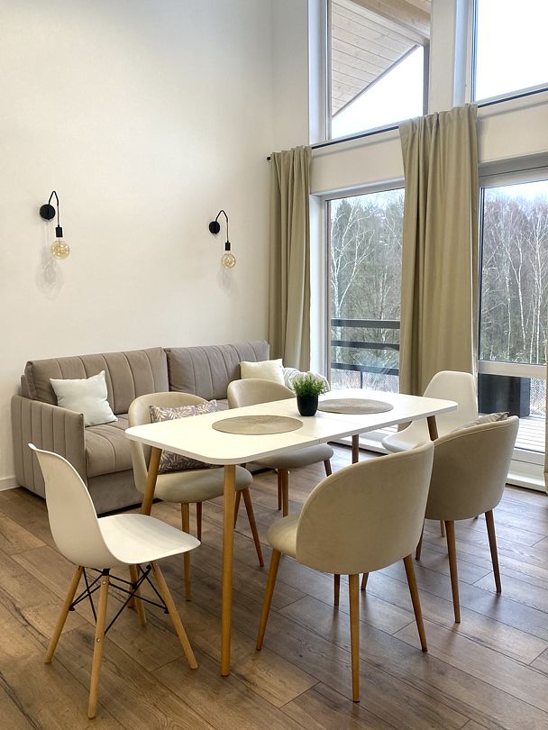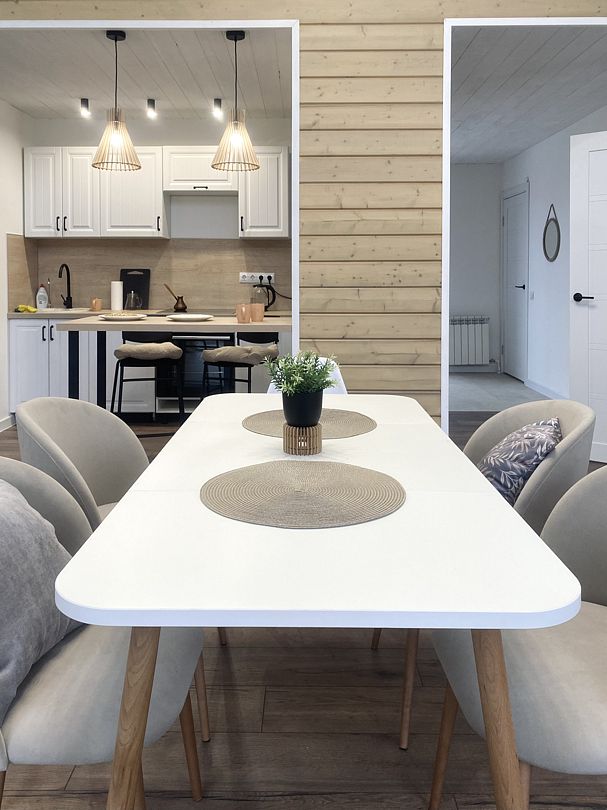 - уютная кухня — гостиная с необходимым набором посуды и посудомоечной машиной;