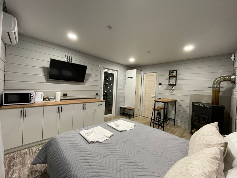 Домик для пары с камином. Размещение без детей. В домике: двуспальная кровать, тумбочки, прихожая, миникухня (микроволновая печь, чайник, минихолодильник), ТВ, скоростной wi-fi.