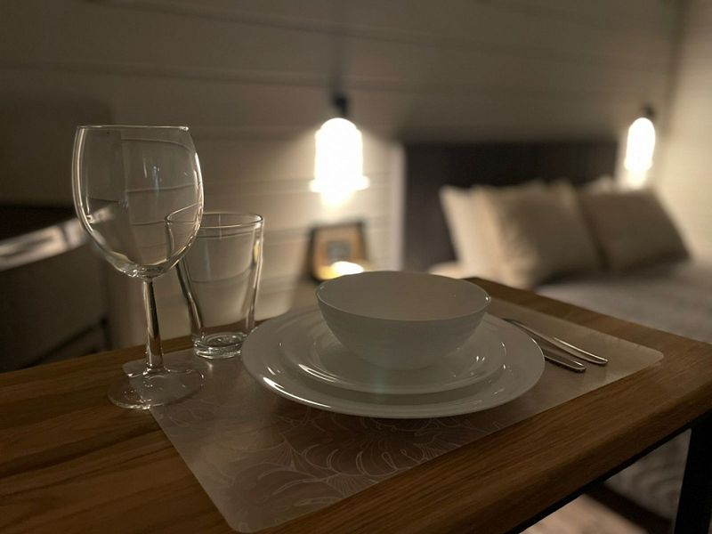 Дом с одной спальней с камином! Размещение без детей! В домике: двуспальная кровать, тумбочки, прихожая, мини-кухня (микроволновая печь, чайник, холодильник), ТВ, скоростной wi-fi.