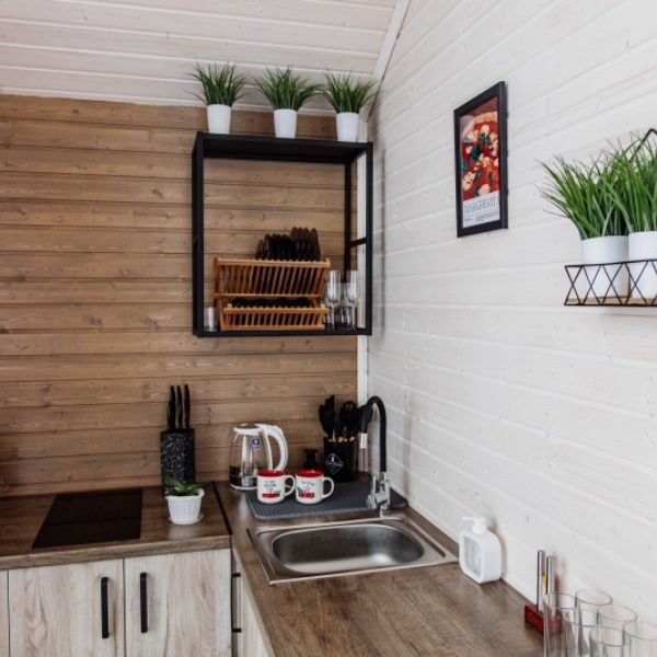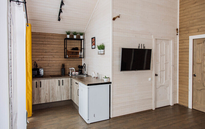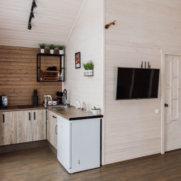 - Кухонный уголок с посудой, холодильником, электрочайником;