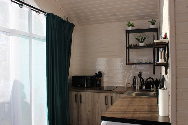 - Кухонный гарнитур, электрическим чайником, микроволновой печью, холодильником, столовыми приборами и необходимой посудой;