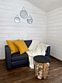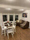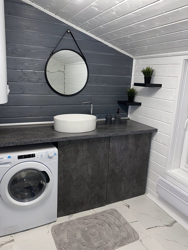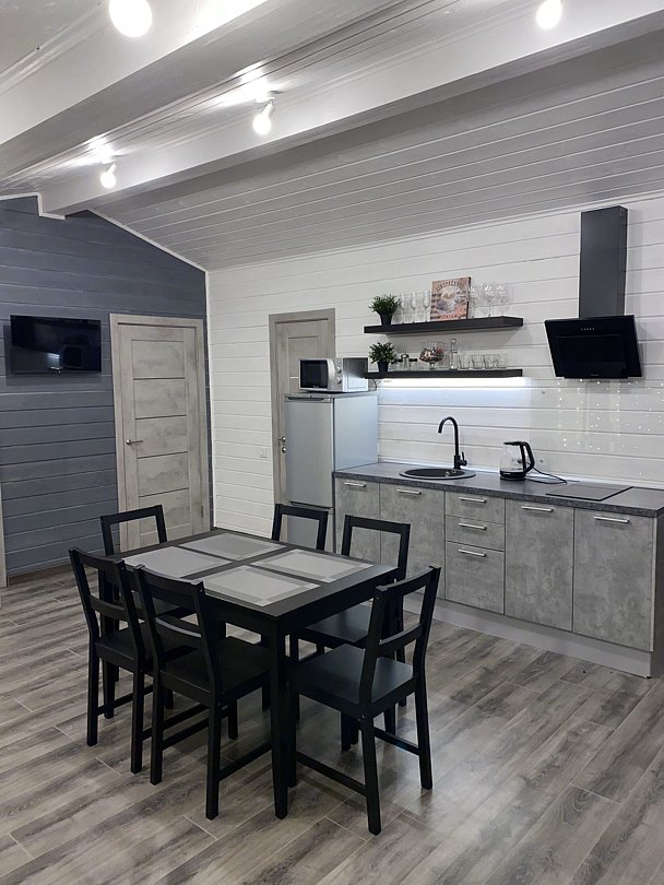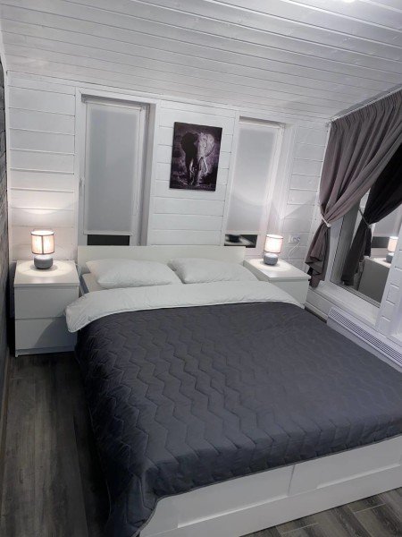 В доме доме с русской баней современный ремонт и приятный интерьер светлых оттенков. Вмещает до 6 взрослых и одного ребенка до 3 лет. Имеются две отдельные спальни с двухспальными кроватями и детской кроваткой. В гостиной есть угловой раскладной диван. В кабинете небольшой раскладной диван.