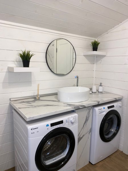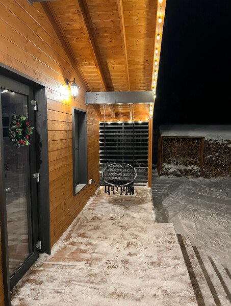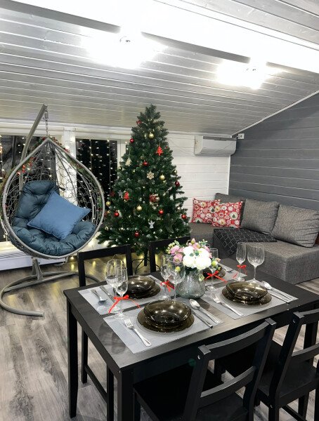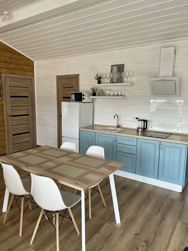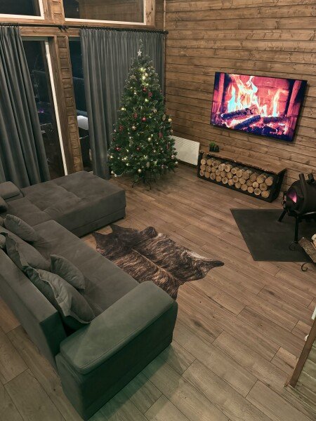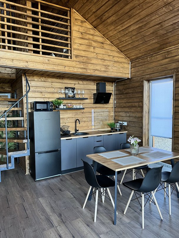 Во всем доме панорамные окна, полностью оборудованная кухня, WiFi, печь-камин (дрова — бесплатно), телевизор Smart TV, проектор, кондиционер, кабинет с рабочей зоной, санузел, сушильная и стиральная машина.