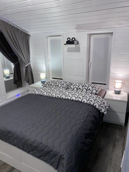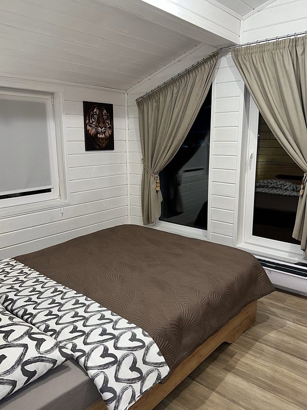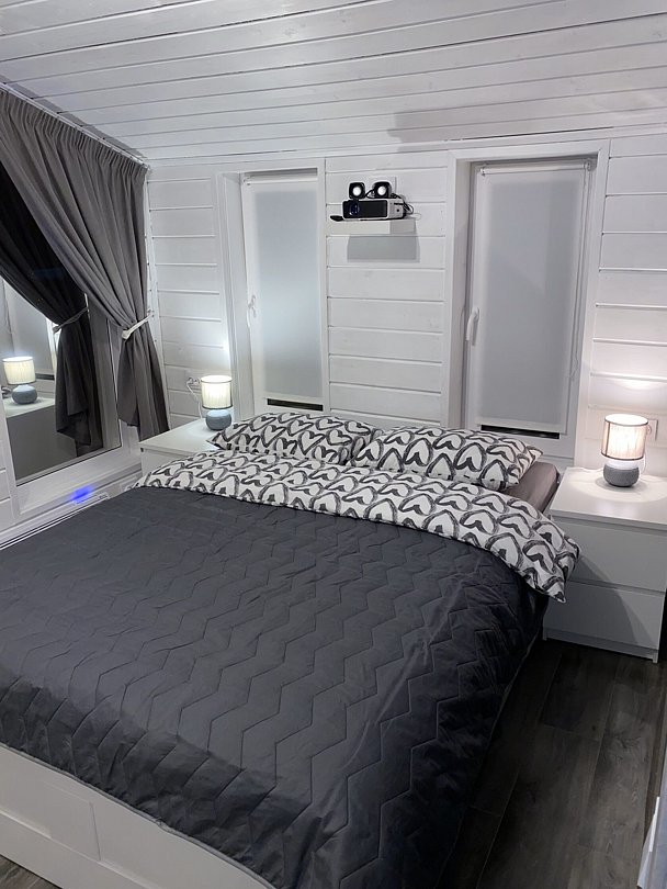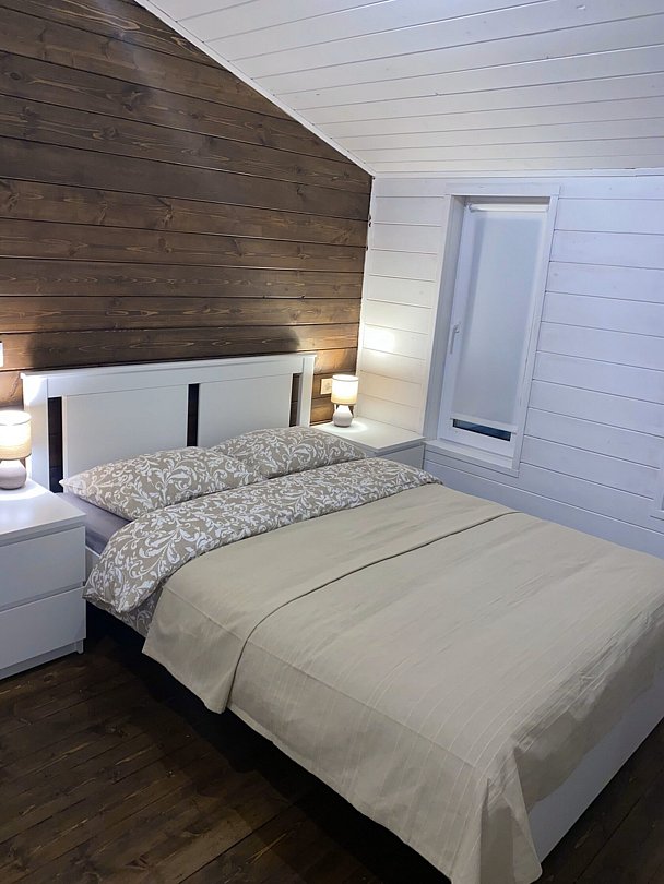 В доме доме с русской баней современный ремонт и приятный интерьер светлых оттенков. Вмещает до 6 взрослых. Имеются две отдельные спальни с двухспальными кроватями и детской кроваткой. В гостиной есть угловой раскладной диван. В кабинете не большой раскладной диван.
