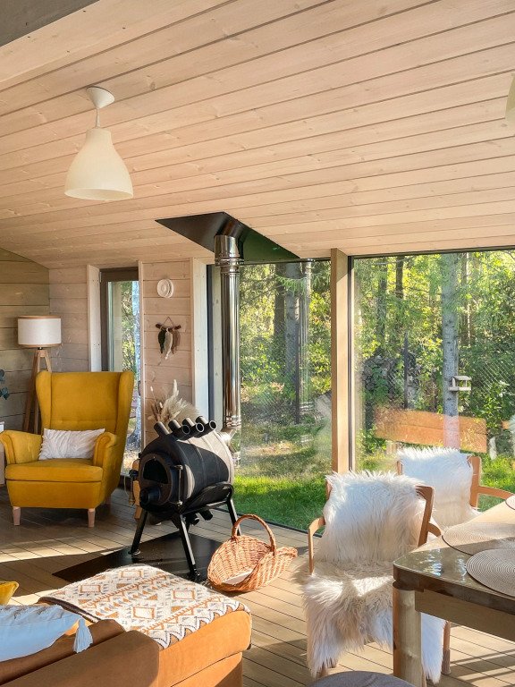 Гостям предлагается частный дом с панорамными окнами с собственным выходом к воде, тремя изолированными комнатами и гостиной. Для комфорта гостей: бытовая техника, мебель, кондиционер, установлены система подогрева пола в санузле, а также фильтры для очистки воды.