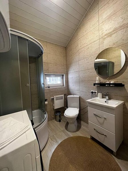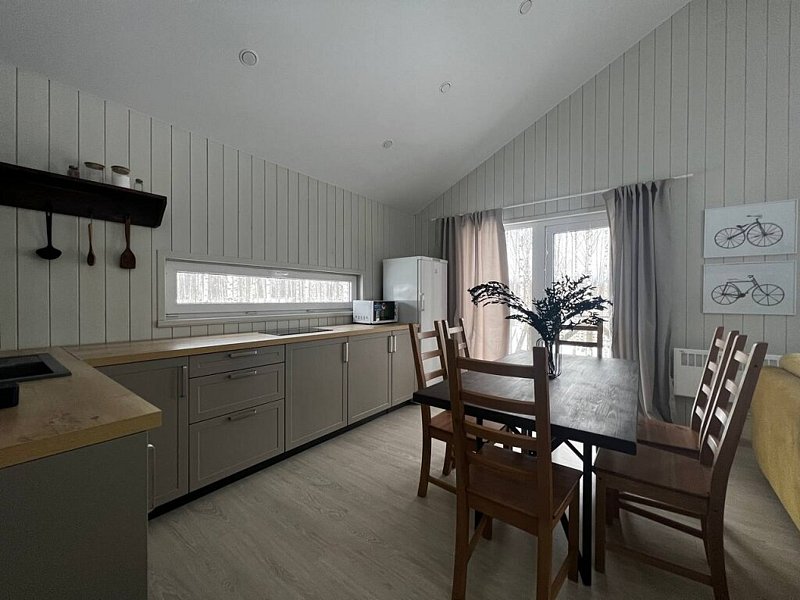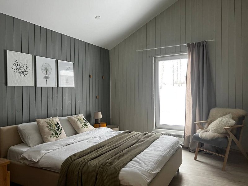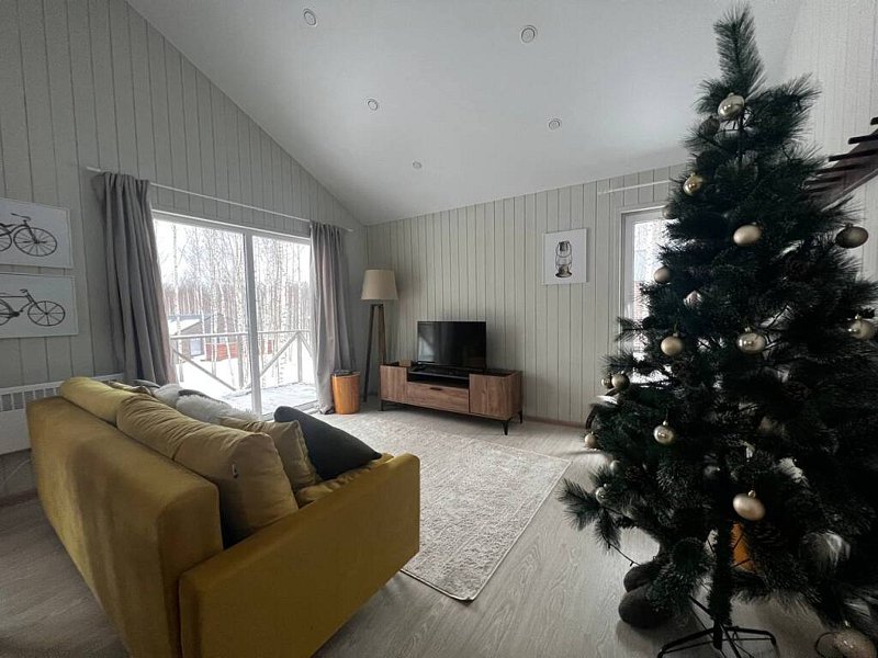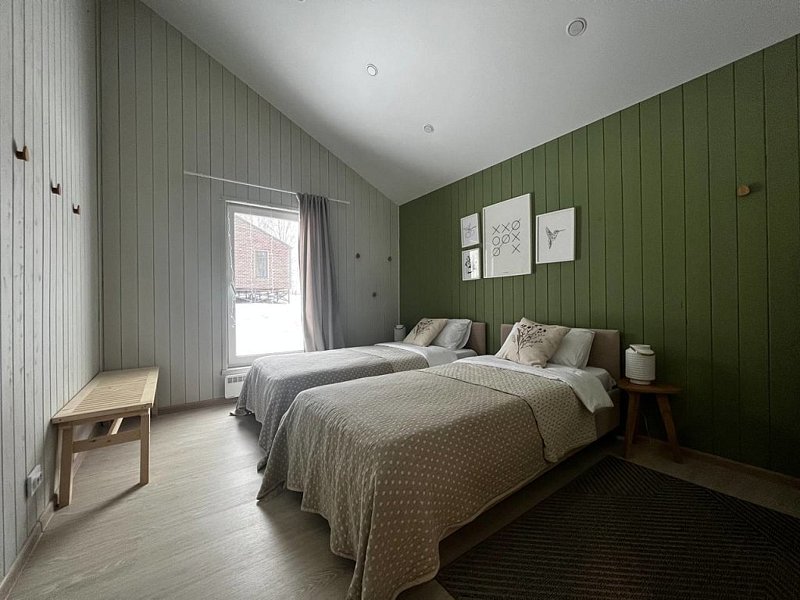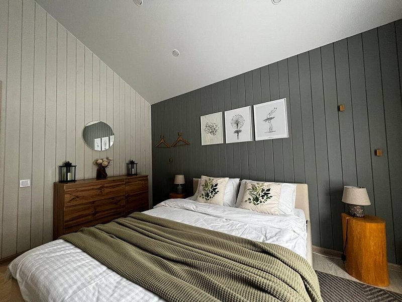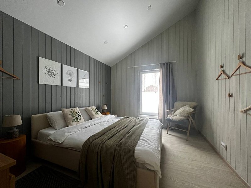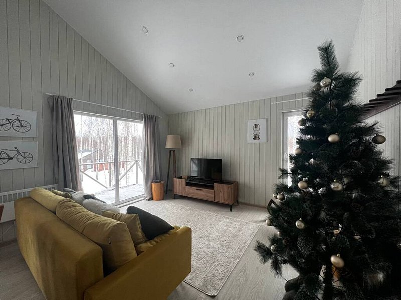 Дом оснащён современной мебелью и техникой, есть необходимое для комфортного отдыха: двуспальная кровать, 2 полутороспальные кровати, диван.