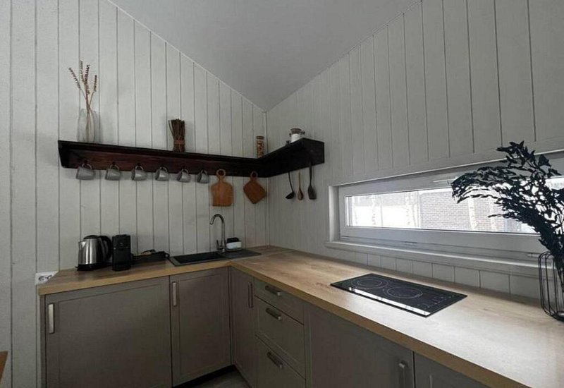 На кухне в распоряжении гостей посуда, варочная панель, микроволновая печь, холодильник, чайник, кофемашина, шампура, решётка, соль, сахар, специи, кофе, чай, масло, крупы.