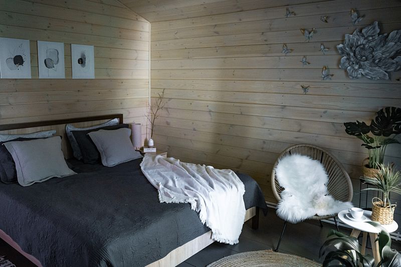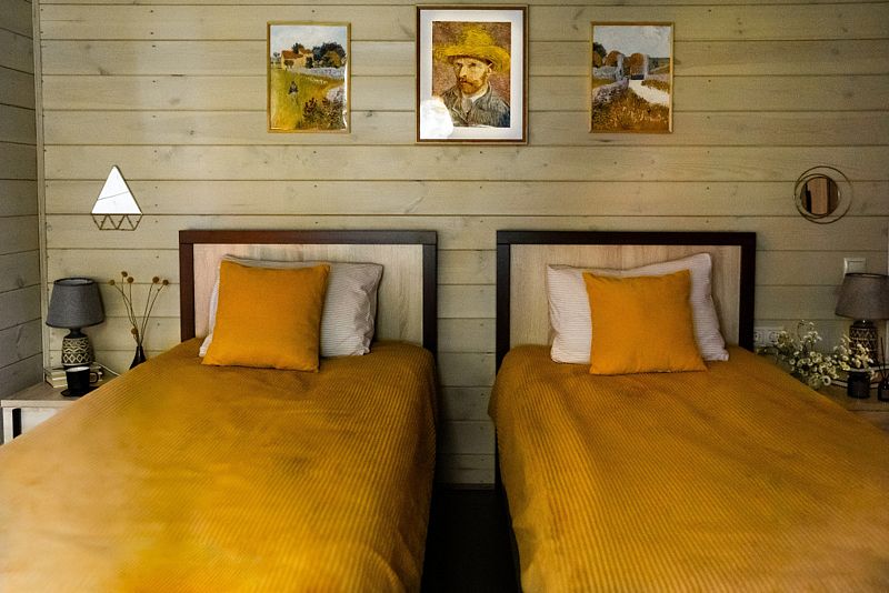 Для размещения в доме есть 2 комнаты и гостиная с диваном для двоих гостей. Максимальное размещение — до 6 гостей. Первая изолированная спальня 15 кв. м.: имеется двухметровая кровать, шкаф, вид из окон в лес, предоставляется постельное бельё и полотенца для каждого гостя. Вторая изолированная спальня 15 кв. м.: 2 кровати по 1.5 м, шкаф, вид из окна в лес, предоставляется постельное бельё и полотенца для каждого гостя. Кухня-гостиная 40 кв. м.: диван, раскладывающийся на двоих, сервированный обеденный стол на 6 гостей, телевизор, книги и настольные игры, кухня с полным набором посуды до 6 гостей, холодильник с морозилкой, посудомоечная машина, микроволновая печь, духовка, электрический чайник, электрическая плита на 2 комфорки. В ванной комнате 5 кв. м. есть душевая кабина, туалет, стиральная машина. В гардеробной 3 кв. м. есть помещение для верхней одежды и крупных вещей, сушилка для вещей, утюг по запросу. На веранде 17 кв. м. есть обеденный стол до 6 гостей, зона для релакса с креслами. В мангальной зоне 20 кв. м. есть костровище для разведения костра, мангал, кресла, в летнее время — лежаки. Предоставляются шампуры и железная посуда для шашлыков. У дома есть парковка для 2 машин.