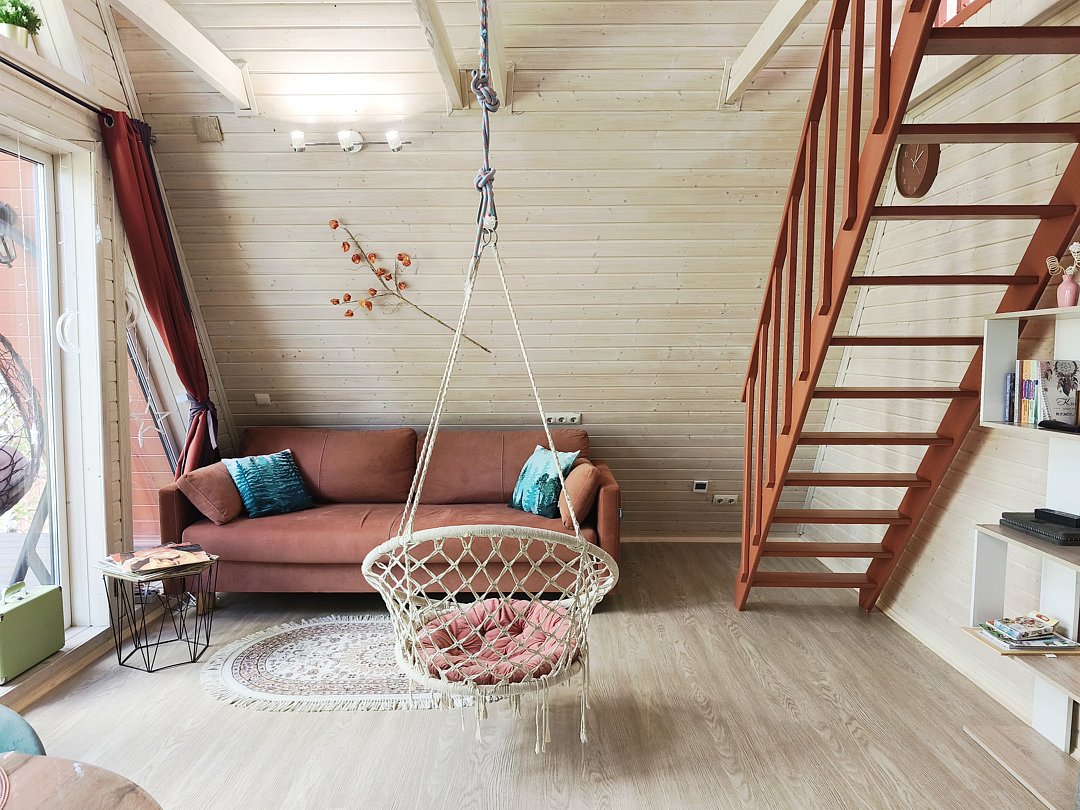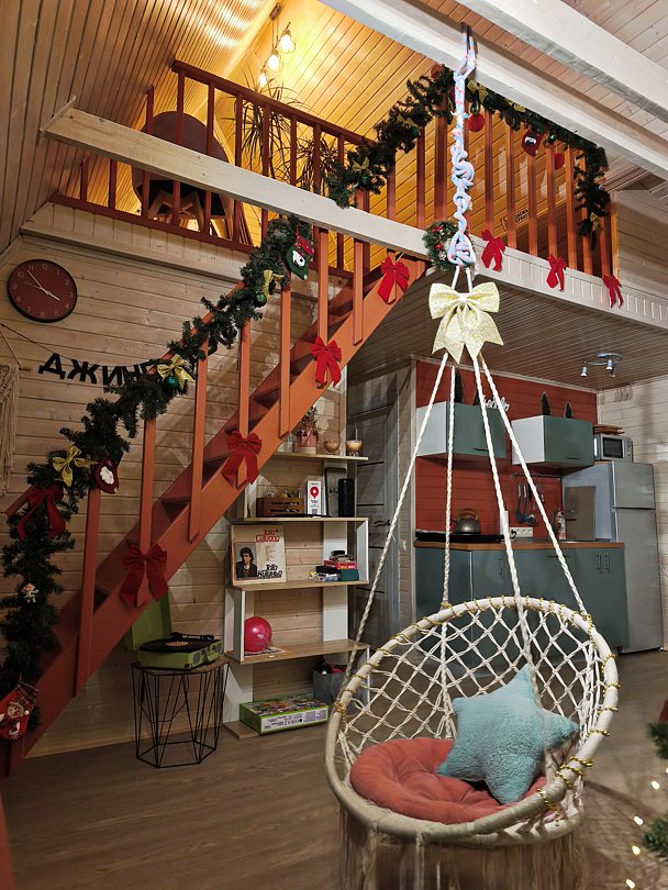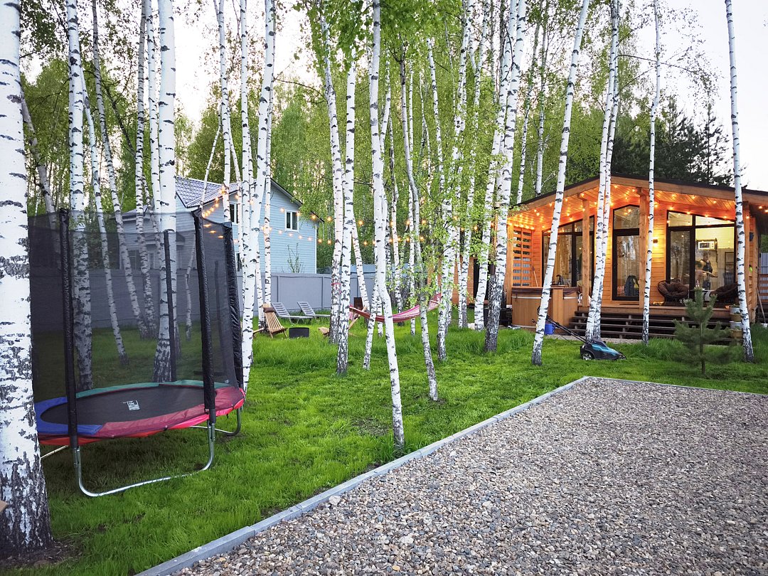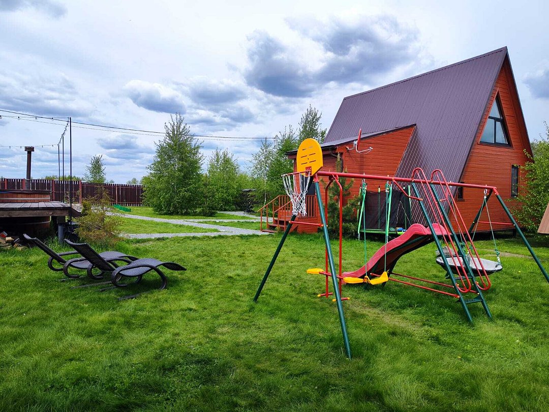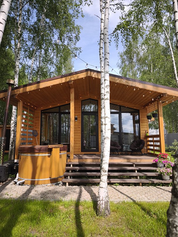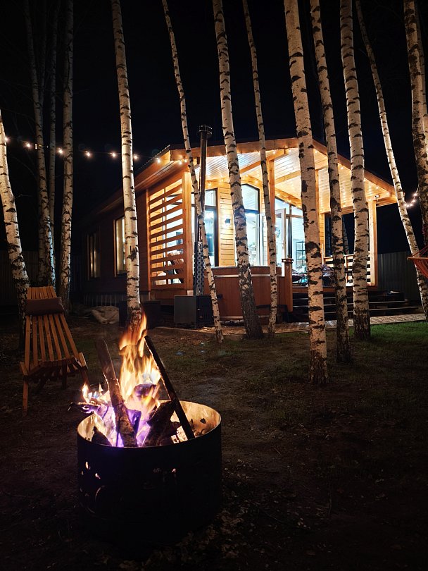 Также в доме есть кондиционер, Wi-Fi, телевизор со смарт-ТВ, виниловый проигрыватель, качели, книги, настольные игры, раскраски и игрушки для малышей. На террасе дома расположились кресла с подушками и уютные качели-кокон, а напротив дома — мангальная зона с обеденным столом и лавочками среди берез. Шампура предоставляются бесплатно.