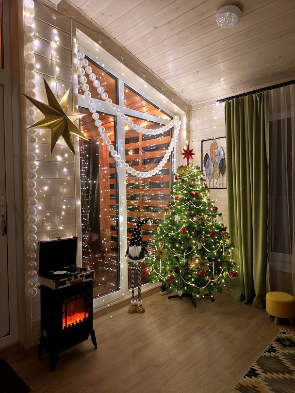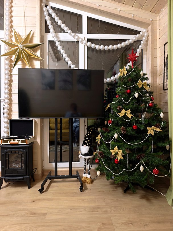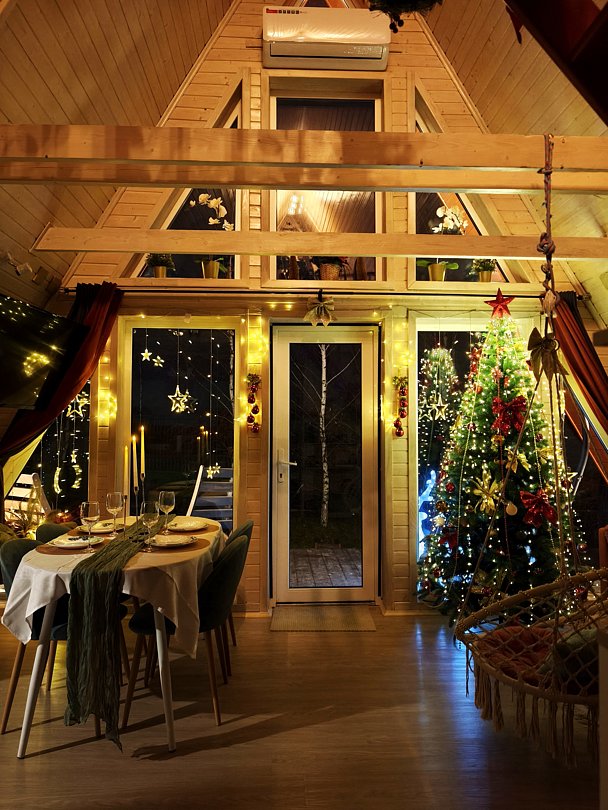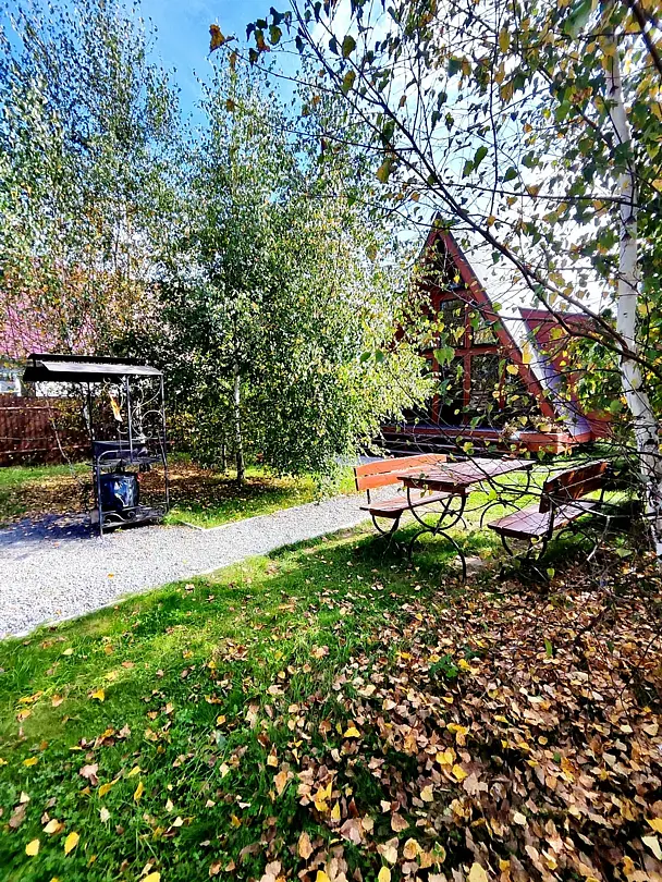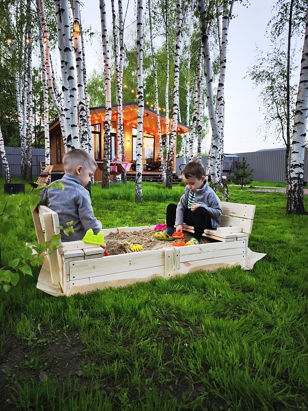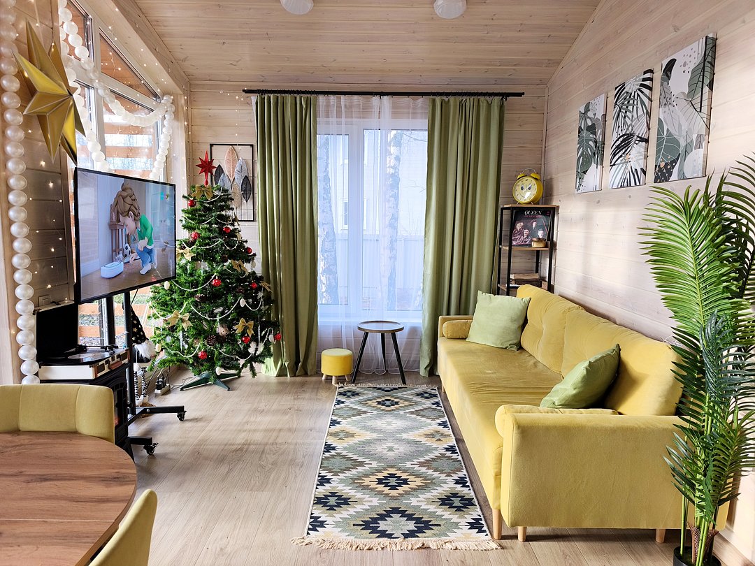 Также в доме есть кондиционер, Wi-Fi, телевизор со смарт-ТВ, виниловый проигрыватель, качели, книги, настольные игры, раскраски и игрушки для малышей. На террасе дома расположились кресла с подушками и уютные качели-кокон, а напротив дома — мангальная зона с обеденным столом и лавочками среди берез. Шампура предоставляются бесплатно.