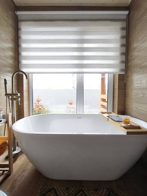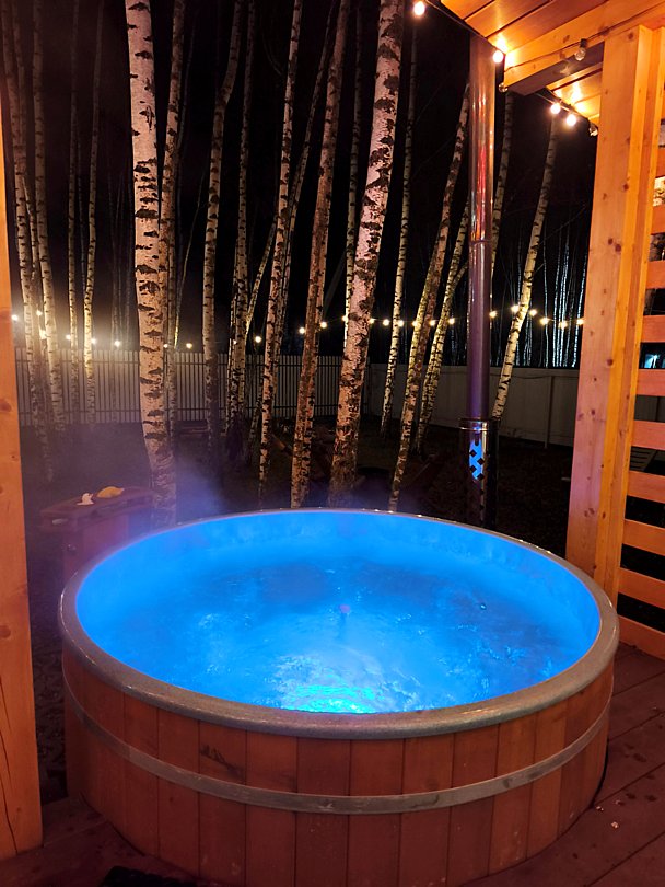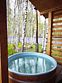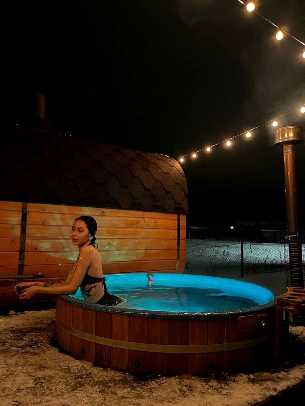 На террасе бани гостей ожидает горячая купель Фурако, которая отапливается дровами и украшена подсветкой. В этом умиротворяющем уголке можно расслабиться, добавив в воду морскую соль, бомбочки для ванны и аромамасла.