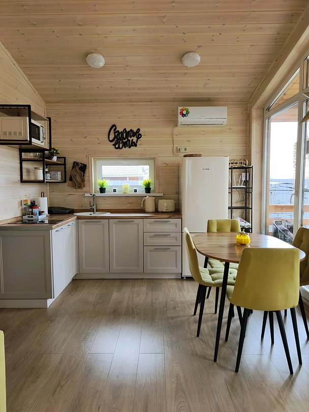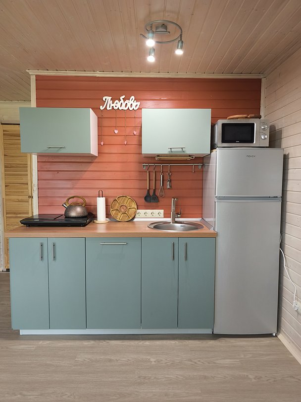 В кухонной зоне: индукционная плита, холодильник, чайник, микроволновка, посуда для приготовления еды и сервировки стола, чай, кофе, сахар, соль, масло, стульчик для кормления малышей. Санузел: душ с горячей водой, унитаз, раковина, полотенца каждому гостю, шампунь, бальзам, мыло, дезодоранты для мужчин и женщин, ватные палочки и диски, лосьон для тела, одноразовые тапочки.