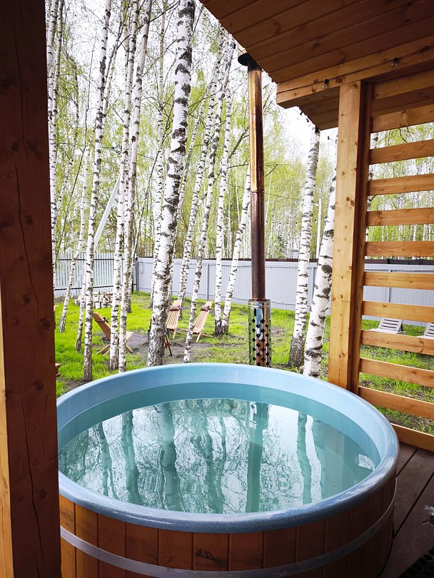 На террасе дома Шале расположена купель, которая оборудована системой подсветки и аэромассажа. Для нагрева воды в купели используется дровяная печь, что позволяет поддерживать оптимальную температуру воды — от 38 до 40 градусов.