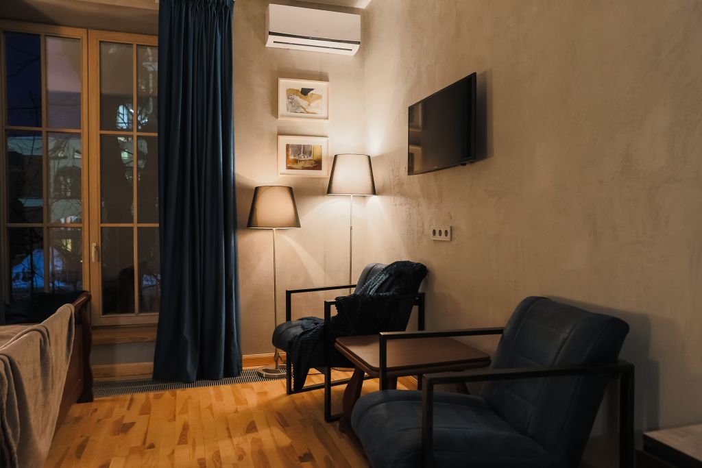 В номере вы найдёте телевизор и халат. Перечисленные услуги есть не во всех номерах.