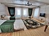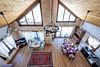 На первом этаже расположены просторная кухня-гостиная и спальня с двуспальным диваном. На втором этаже общая комната с тремя двуспальными и одной односпальной кроватью.