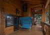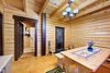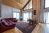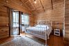 На первом этаже коттеджа находится просторная гостиная с витражными окнами и выходом на террасу. Гостиная совмещена с обеденной зоной и полностью оборудованной кухней. В спальне на первом этаже расположены двуспальная и односпальная кровати.
