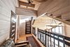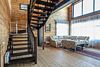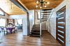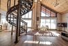 На первом этаже коттеджа находится просторная гостиная с витражными окнами и выходом на террасу. Гостиная совмещена с обеденной зоной и полностью оборудованной кухней. Центр гостиной украшает изящная винтовая лестница.