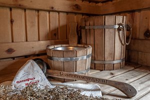 В комплект входят все необходимые принадлежности, включая веник, полотенца, шапочки, простыни, одноразовые тапочки, гель для душа, шампунь, а также натуральная заварка на травах и мед.