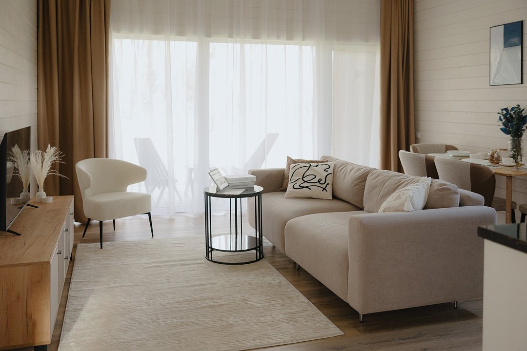 Дома от 86 до 90 кв. м по краю курортного поселка с воздушными интерьерами, собственной кухней, ванной комнатой с теплыми полами, двумя спальнями, двумя балконами, уютной гостиной и обеденной зоной.