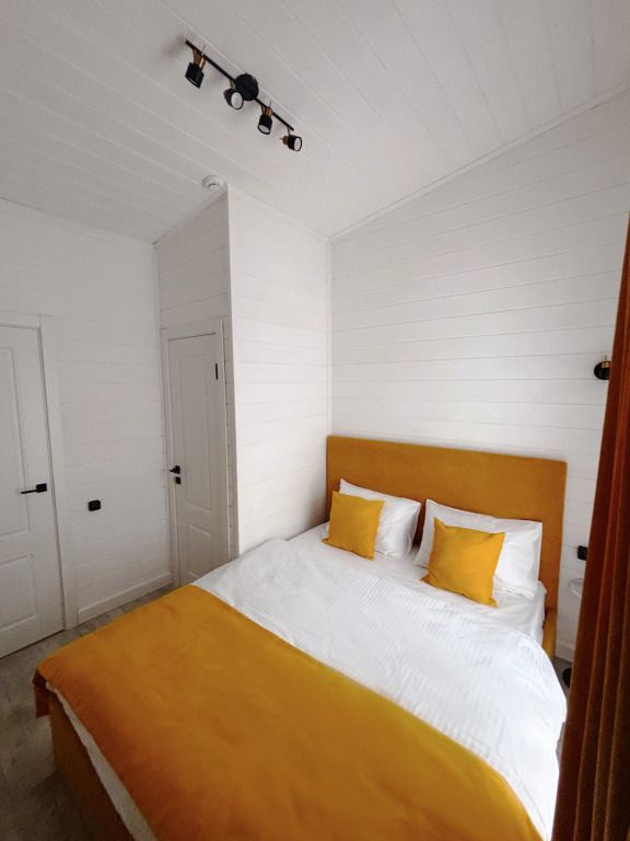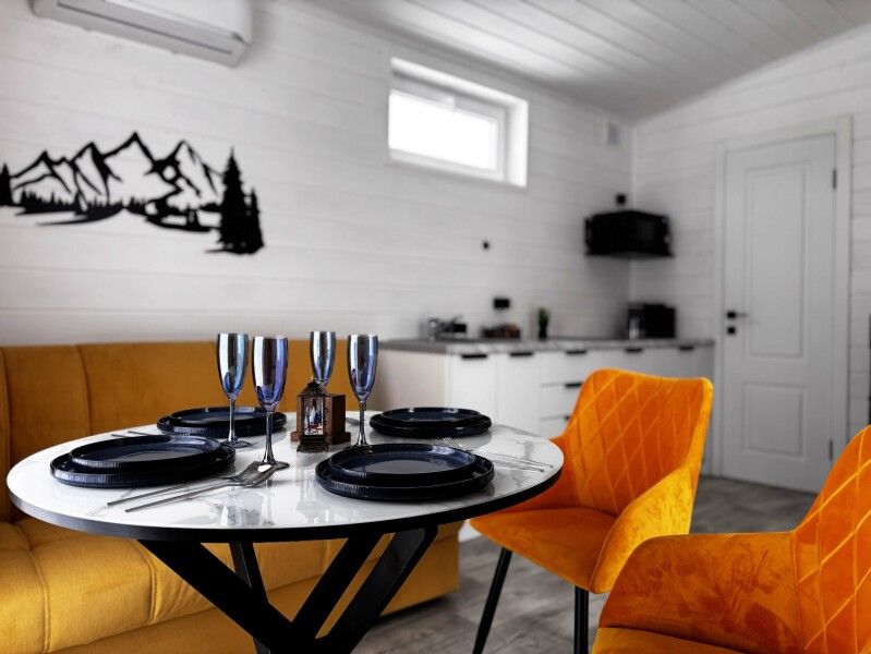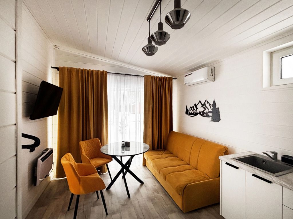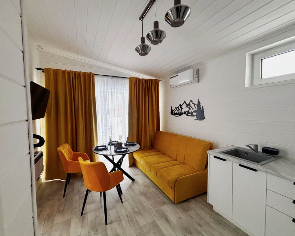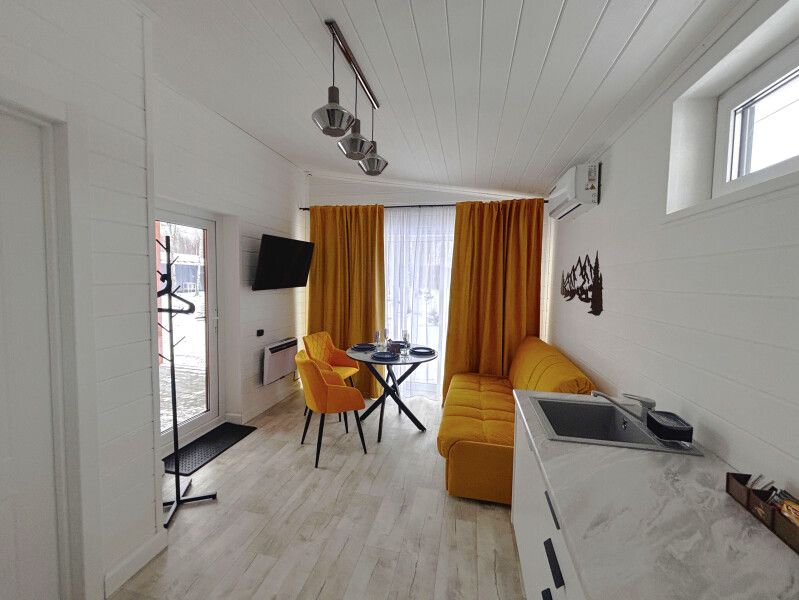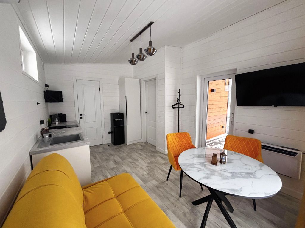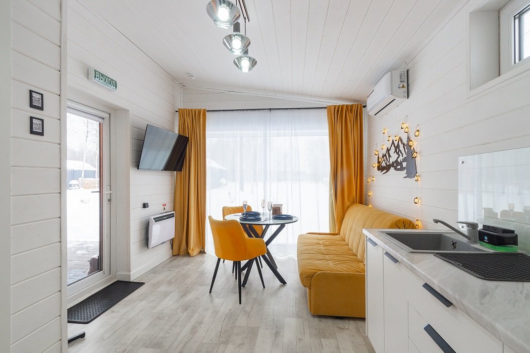В домике есть отдельная спальня с двухместной кроватью, санузел с душевой кабиной, кухня-гостиная с панорамным окном и раскладным диваном. Интерьер выполнен в белых и солнечно-желтых тонах.
