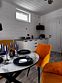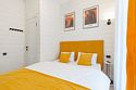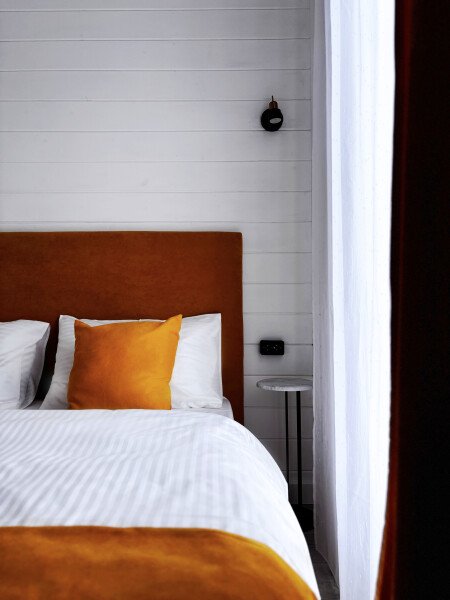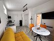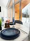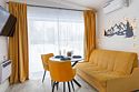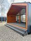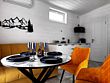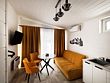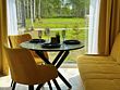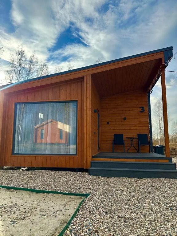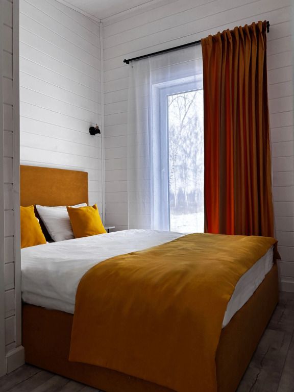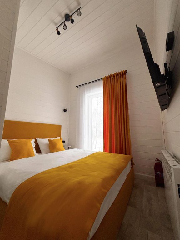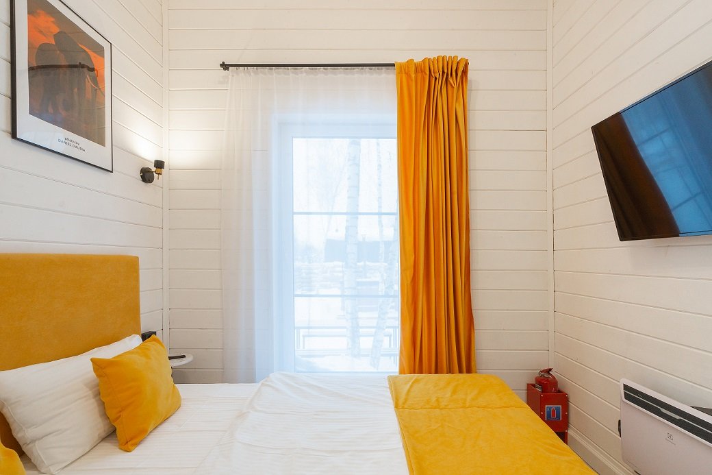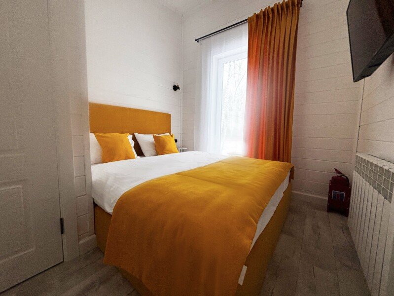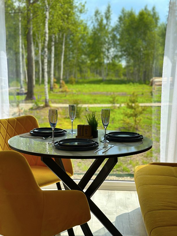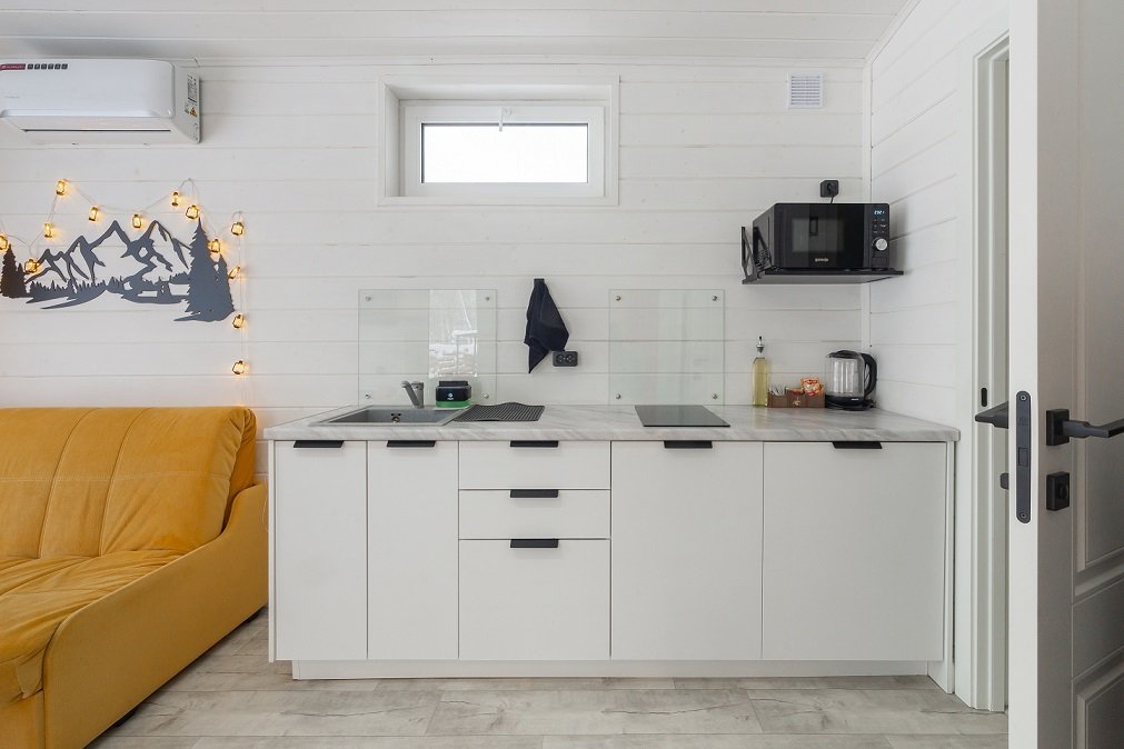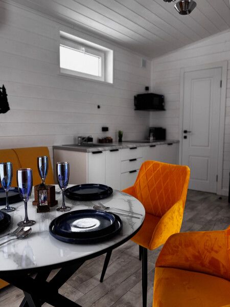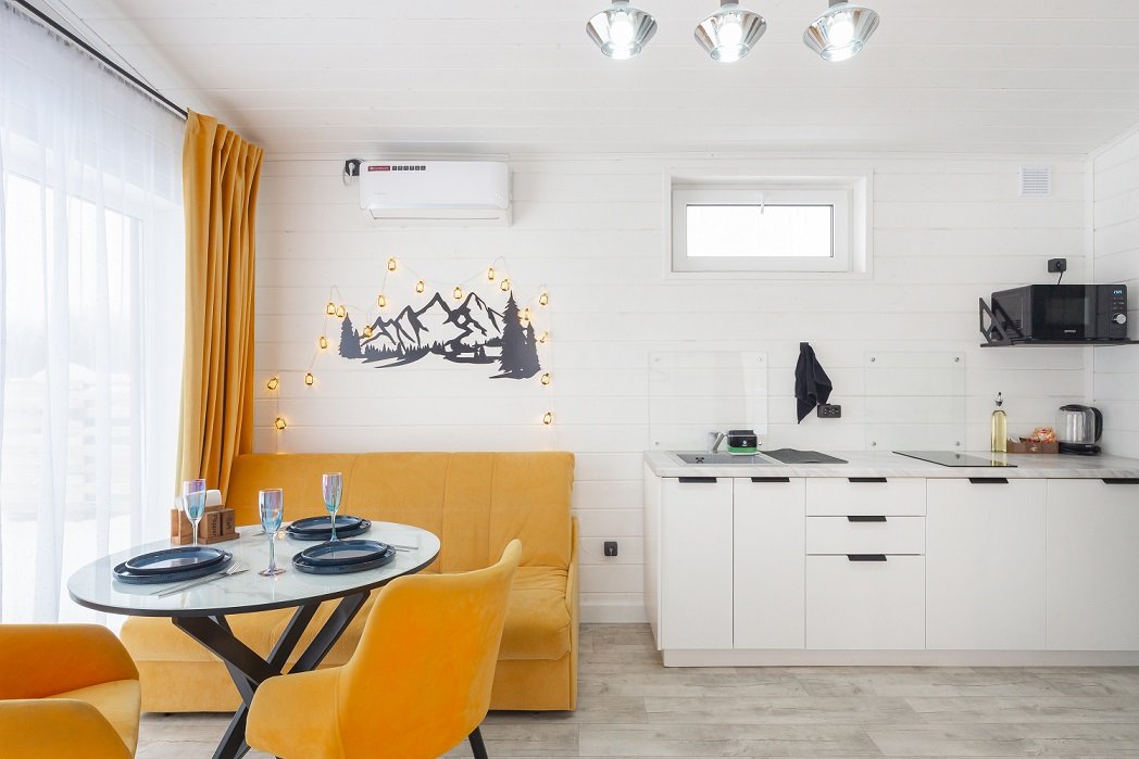 В домике есть отдельная спальня с двухместной кроватью, санузел с душевой кабиной, кухня-гостиная с панорамным окном и раскладным диваном. Интерьер выполнен в белых и солнечно-желтых тонах.