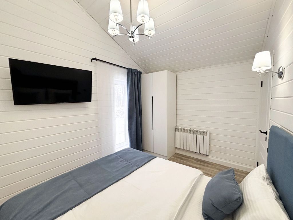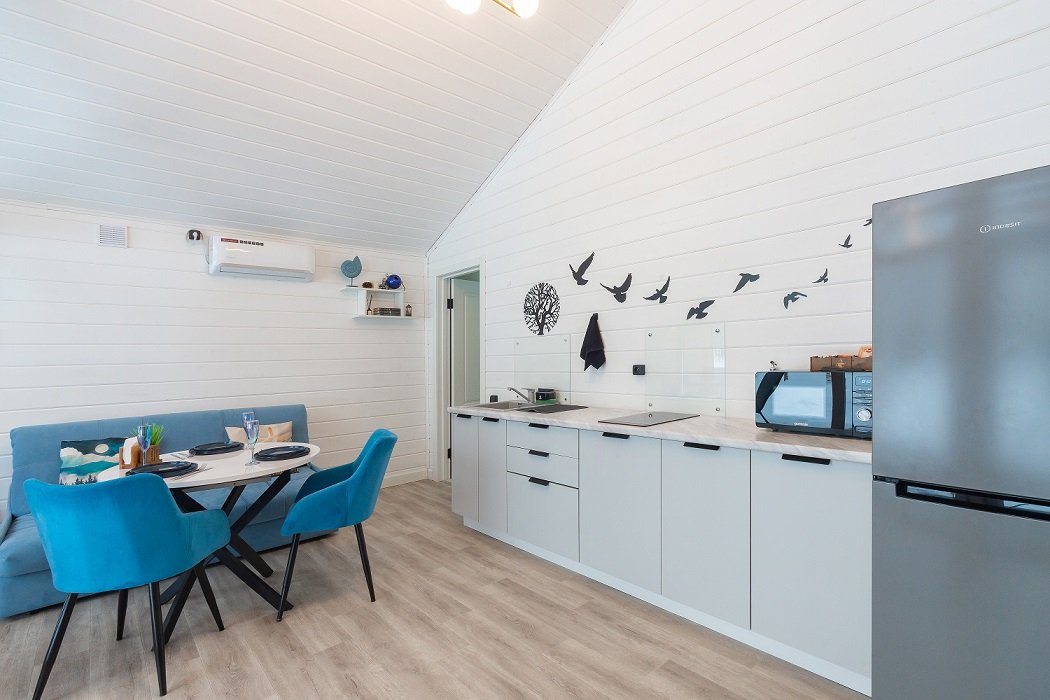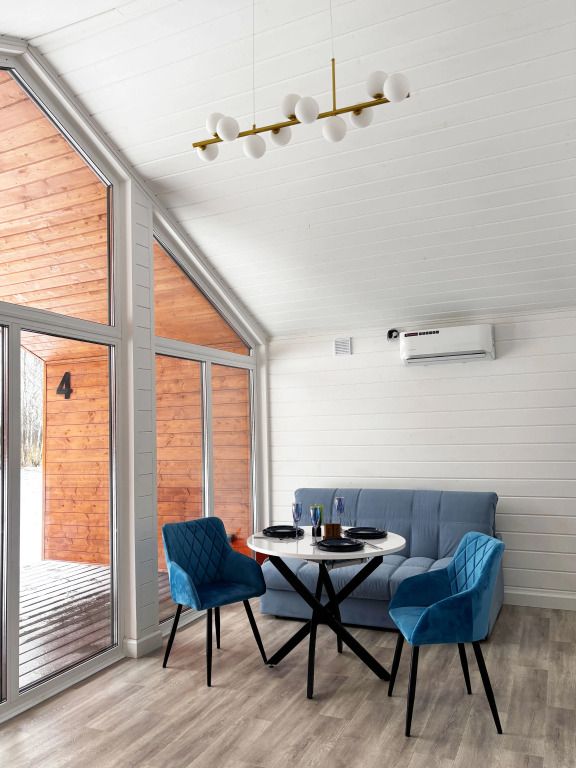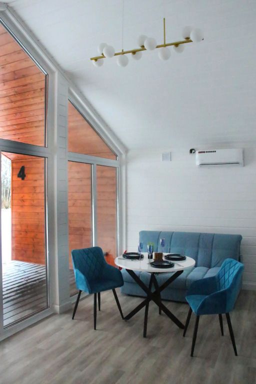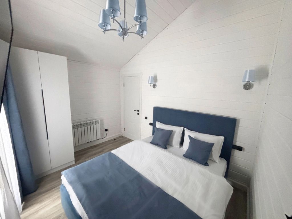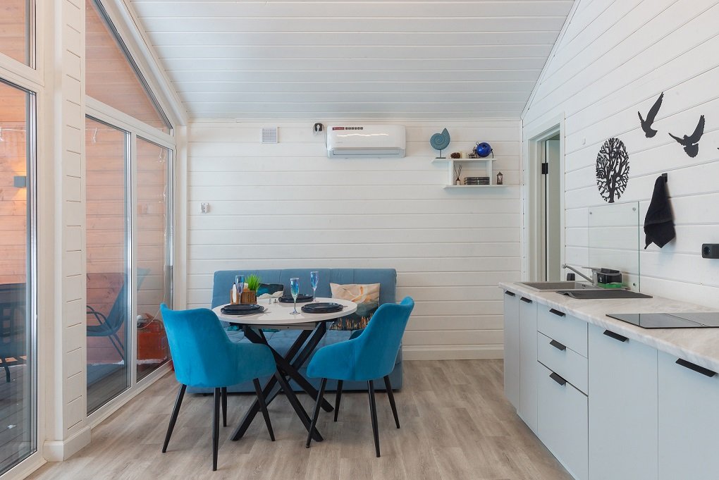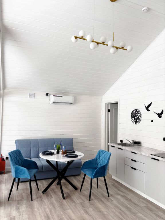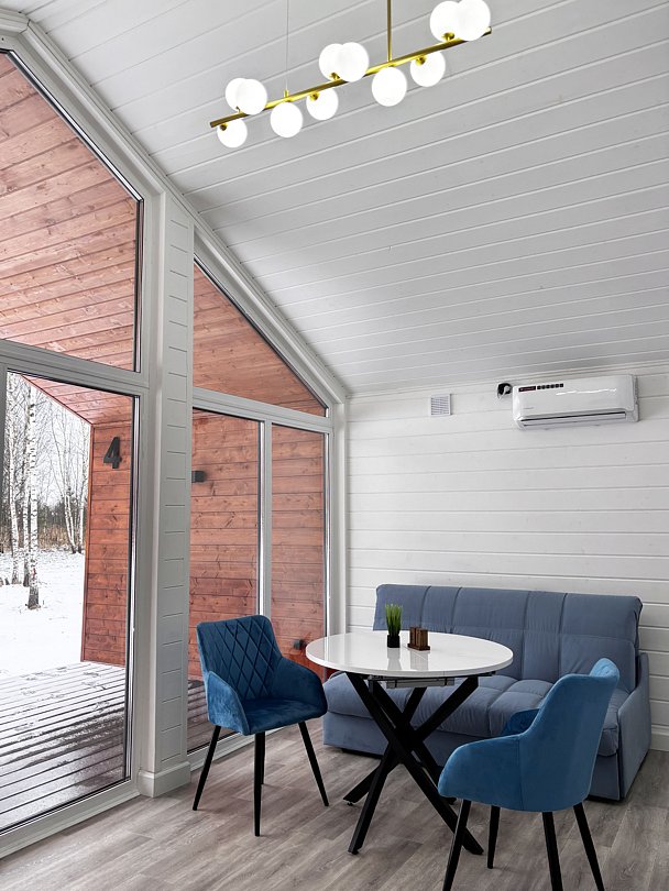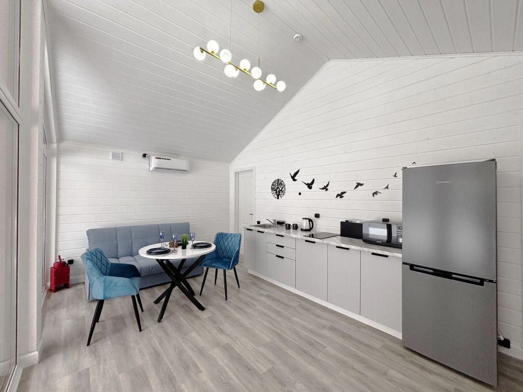 В домике есть отдельная спальня с двухместной кроватью, санузел с душевой кабиной, кухня-гостиная с панорамным окном и раскладным диваном. Интерьер выполнен в белых и лазурных тонах.
