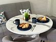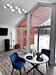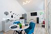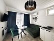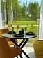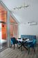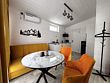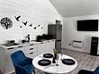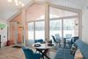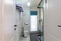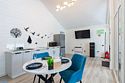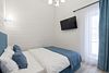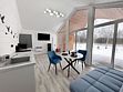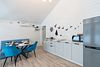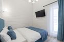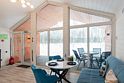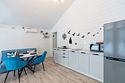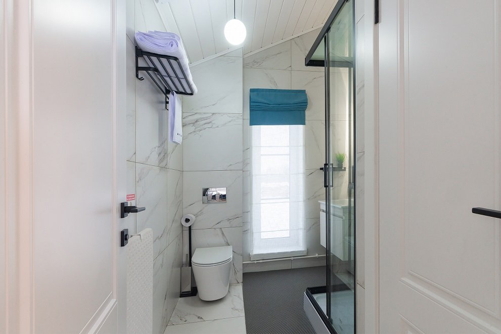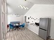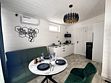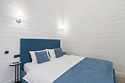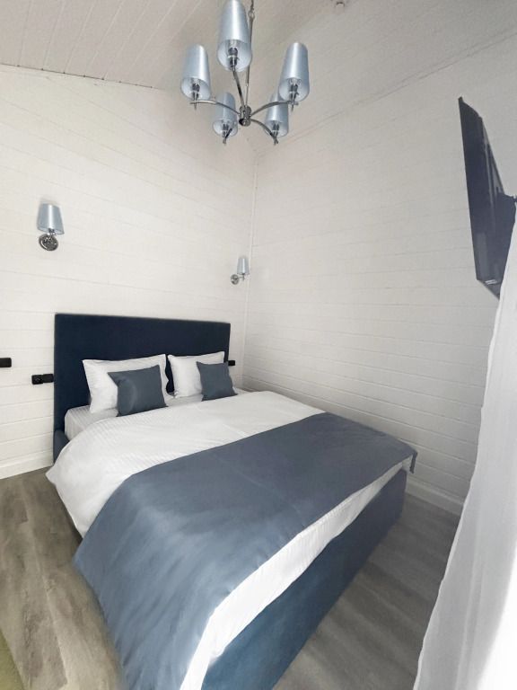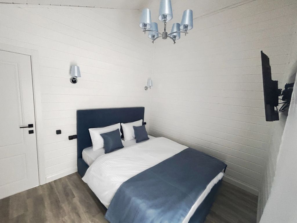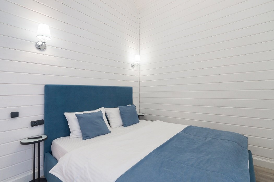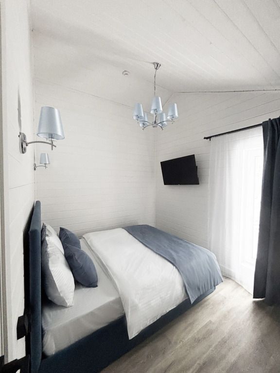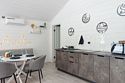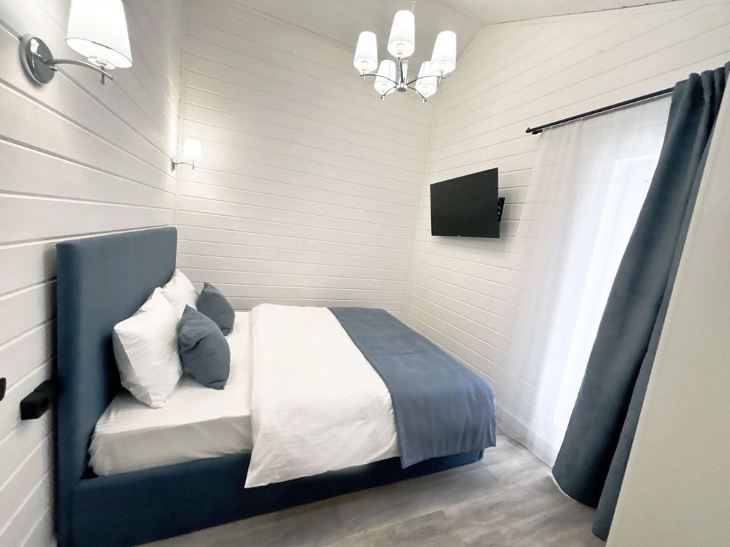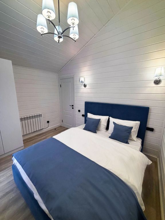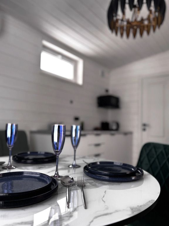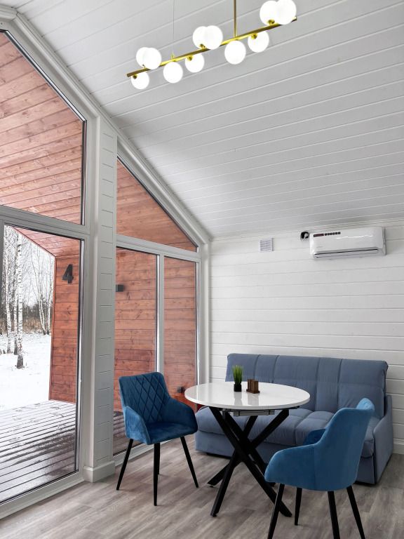 В домике есть отдельная спальня с двухместной кроватью, санузел с душевой кабиной, кухня-гостиная с панорамным окном и раскладным диваном. Интерьер выполнен в белых и лазурных тонах.