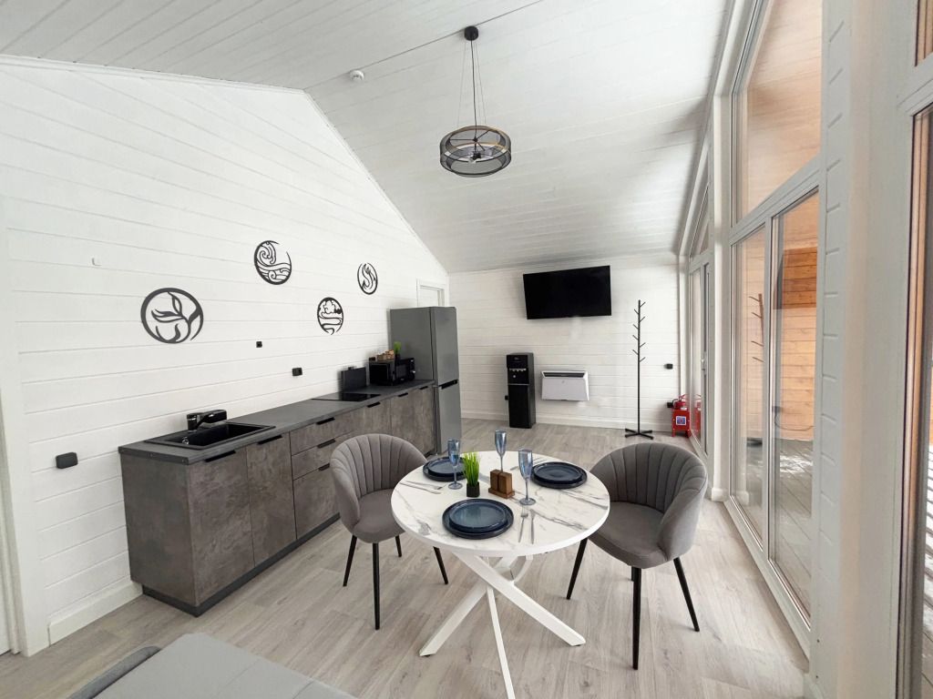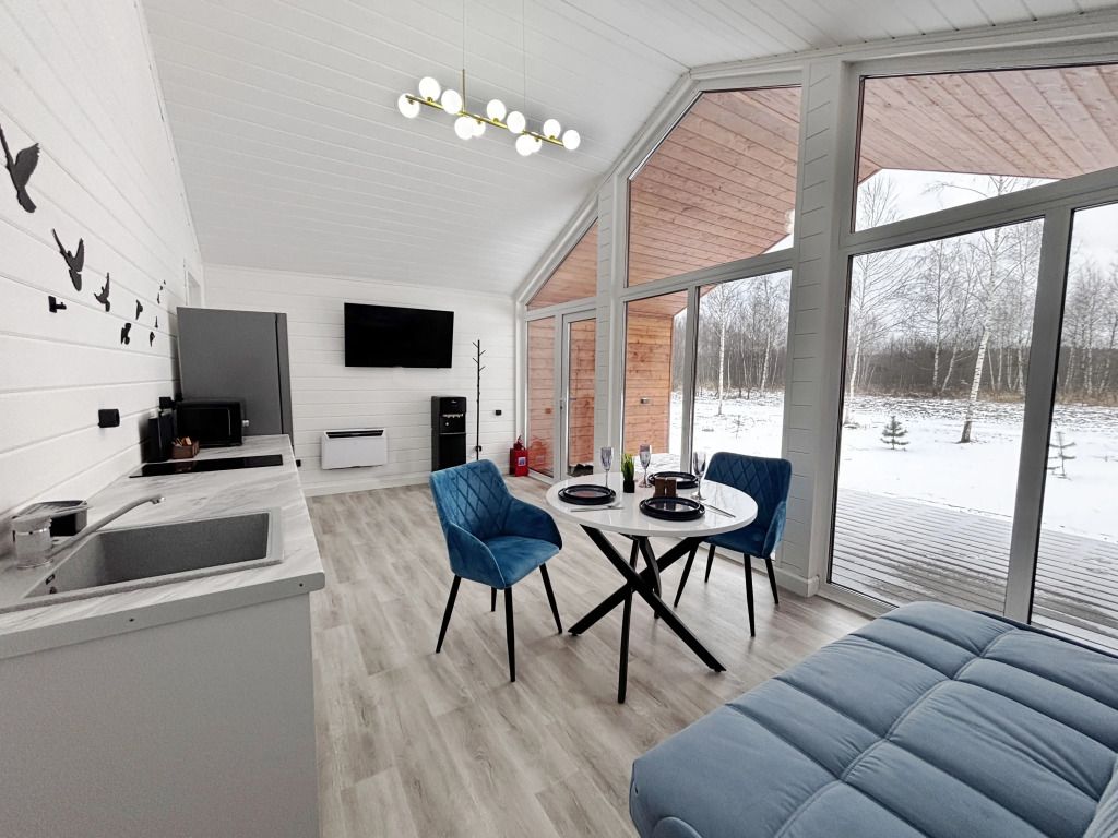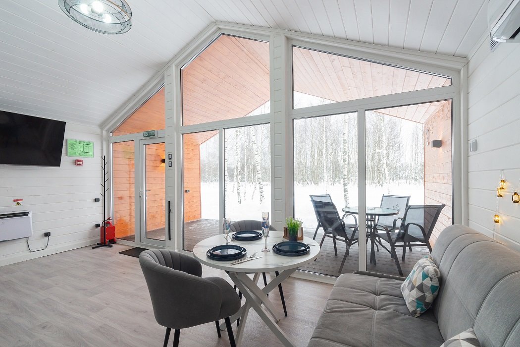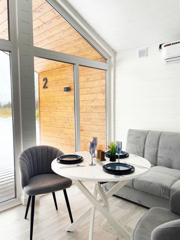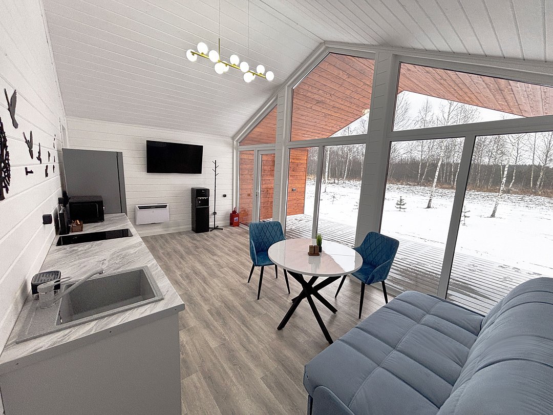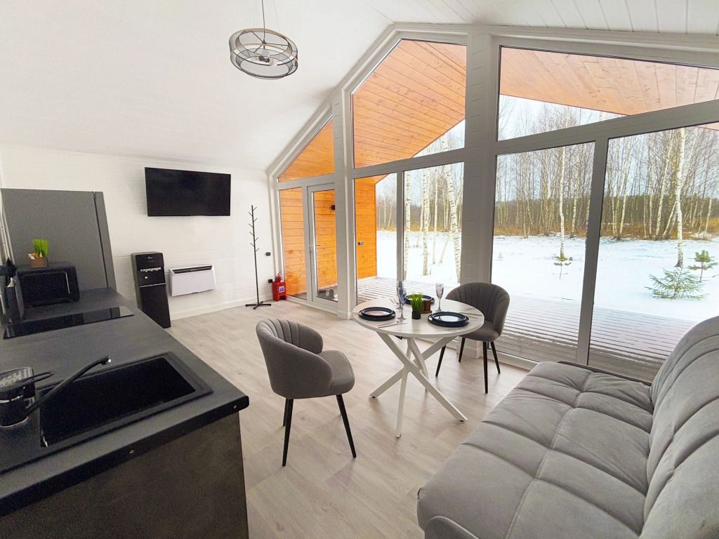 В домике есть отдельная спальня с двухместной кроватью, санузел с душевой кабиной, кухня-гостиная с панорамным остеклением и раскладным диваном. Интерьер выполнен в белых и серых тонах.