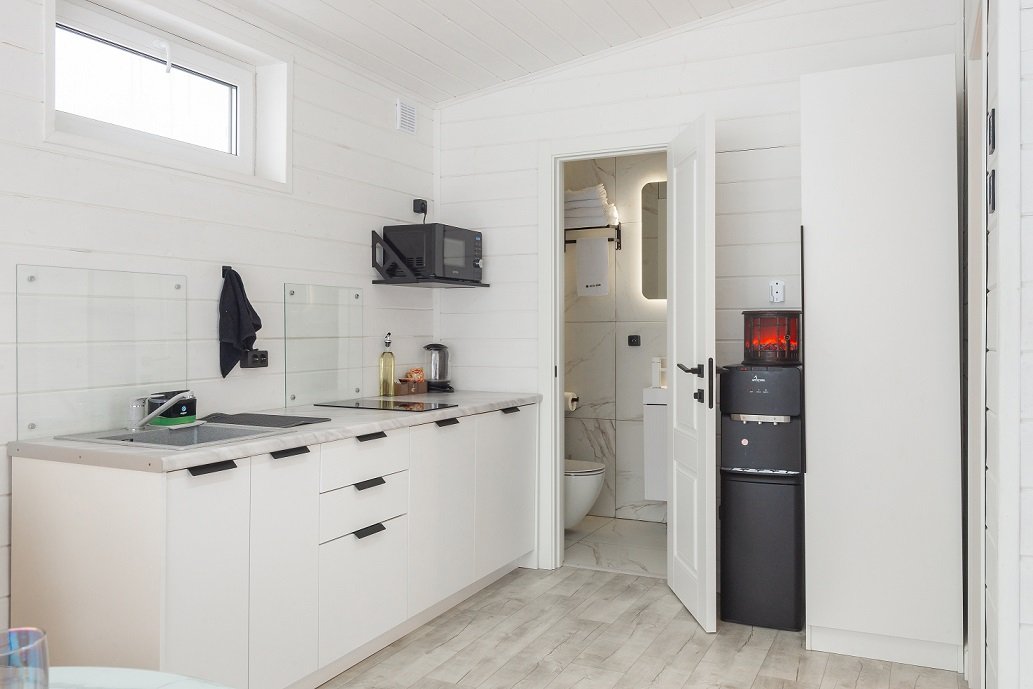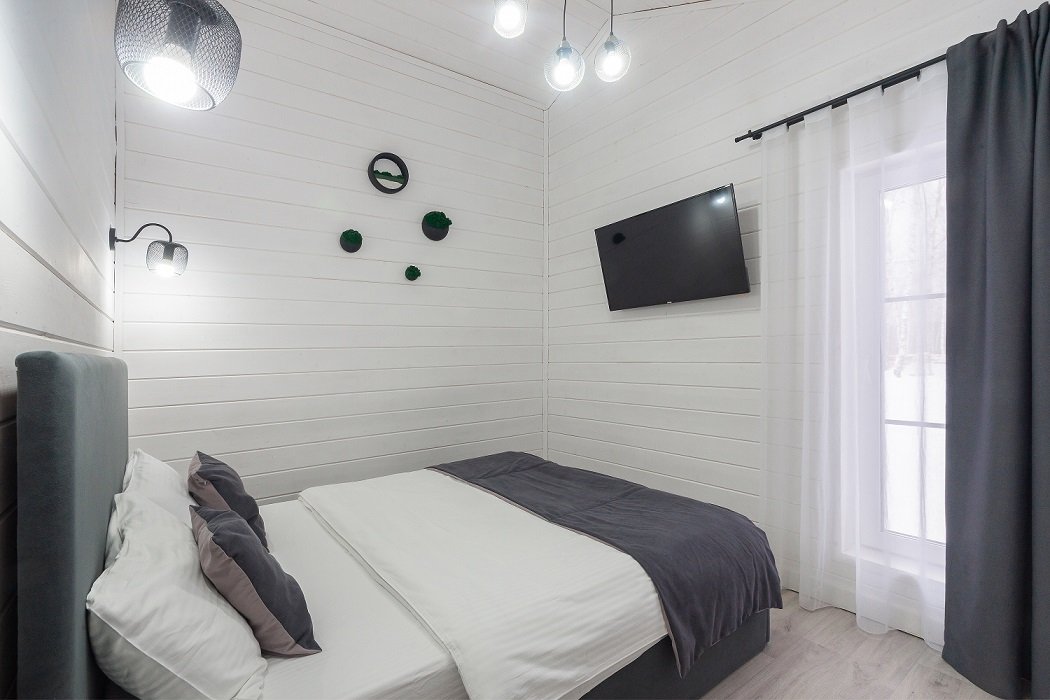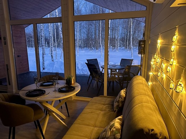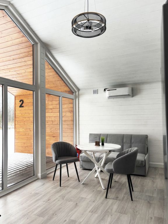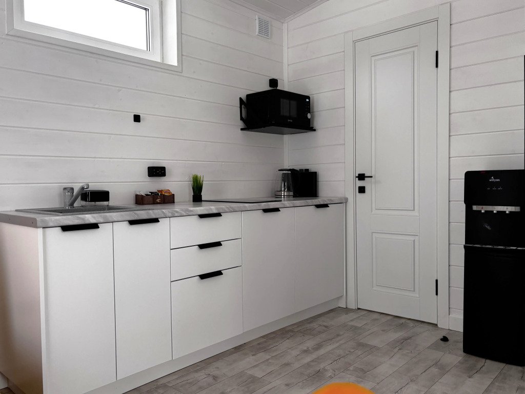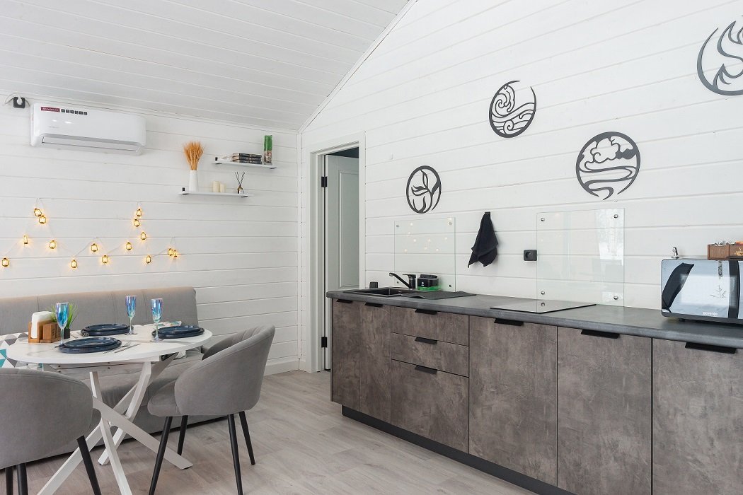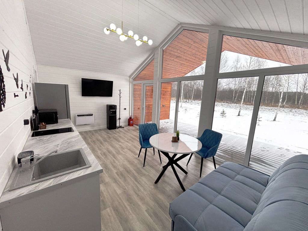 В домике есть отдельная спальня с двухместной кроватью, санузел с душевой кабиной, кухня-гостиная с панорамным остеклением и раскладным диваном. Интерьер выполнен в белых и серых тонах.