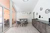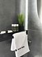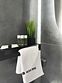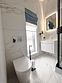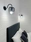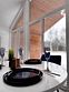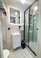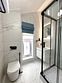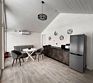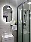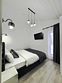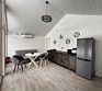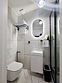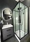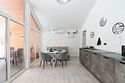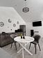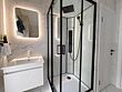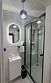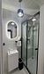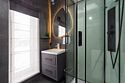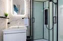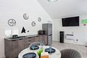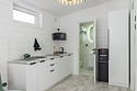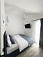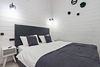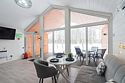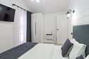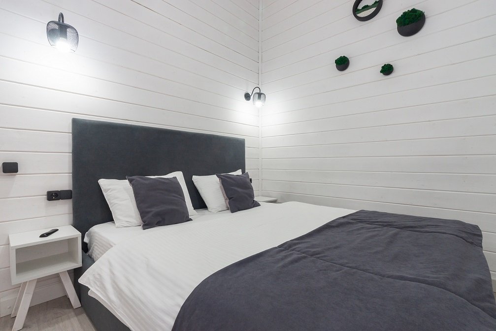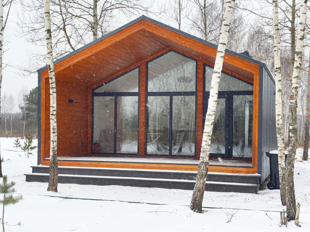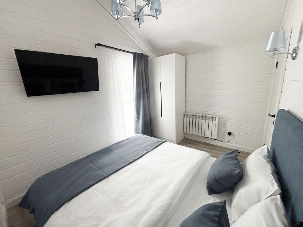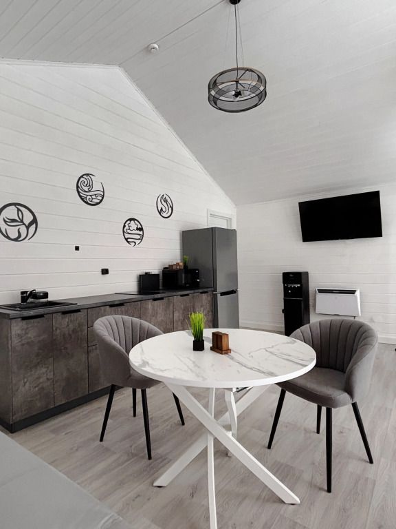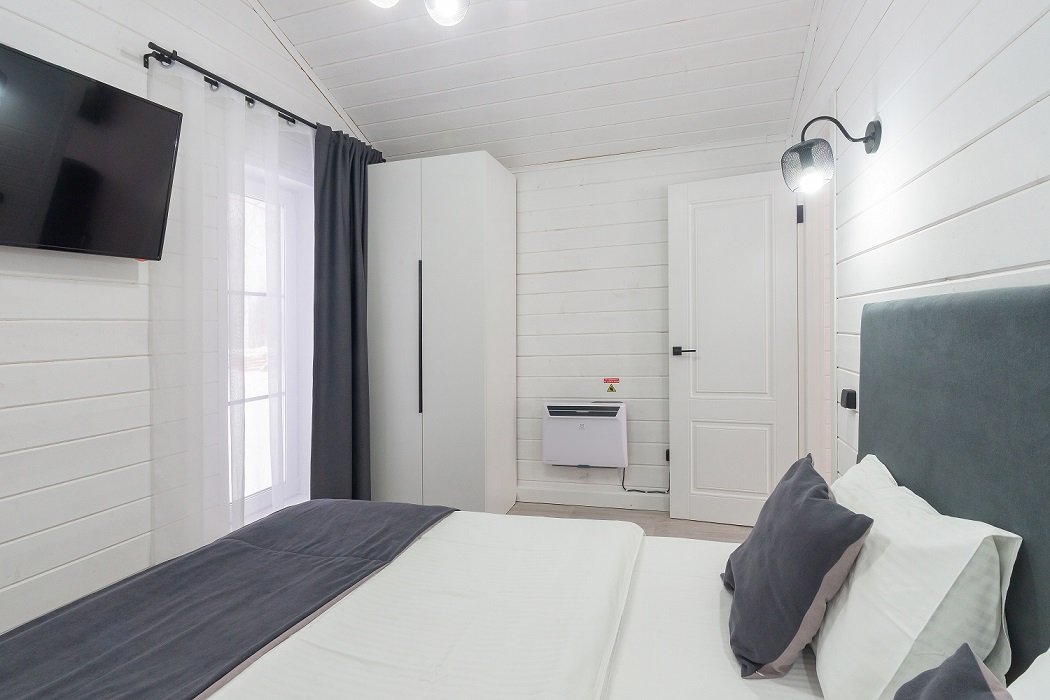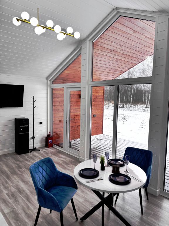 В домике есть отдельная спальня с двухместной кроватью, санузел с душевой кабиной, кухня-гостиная с панорамным остеклением и раскладным диваном. Интерьер выполнен в белых и серых тонах.