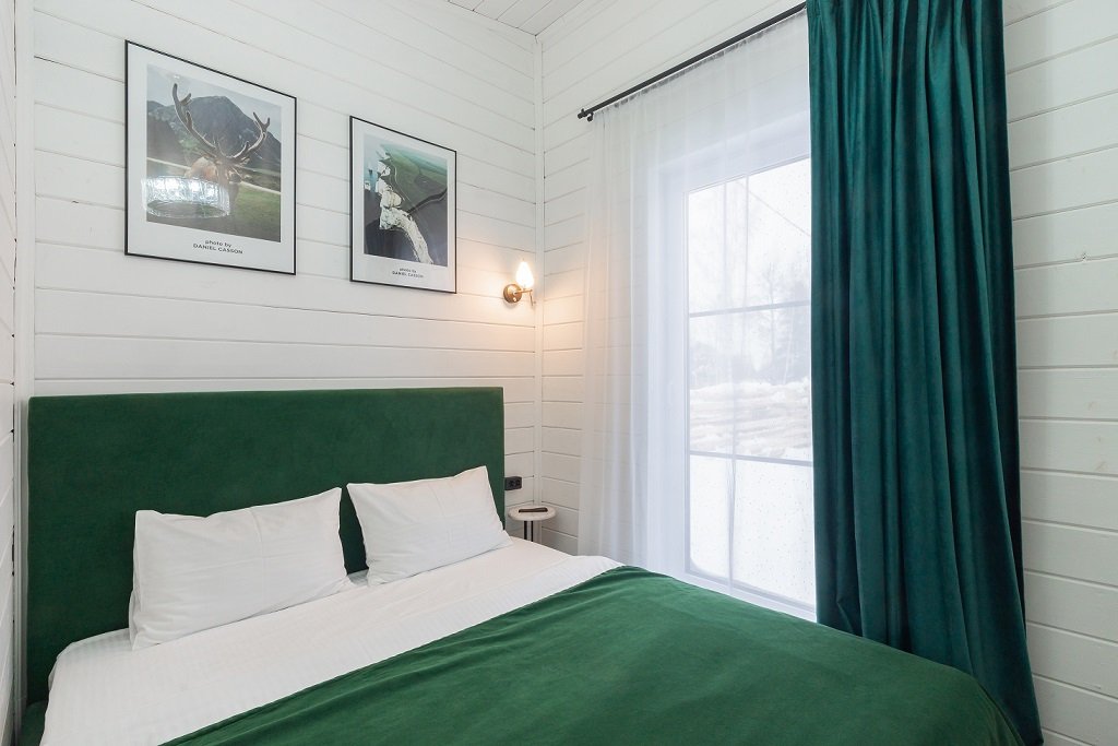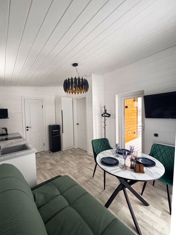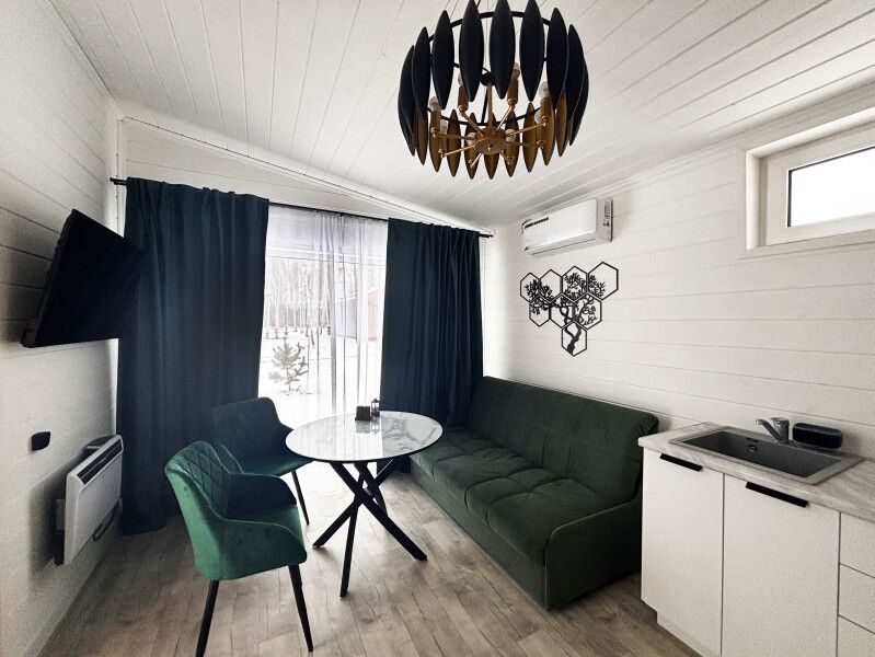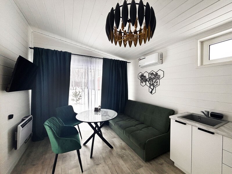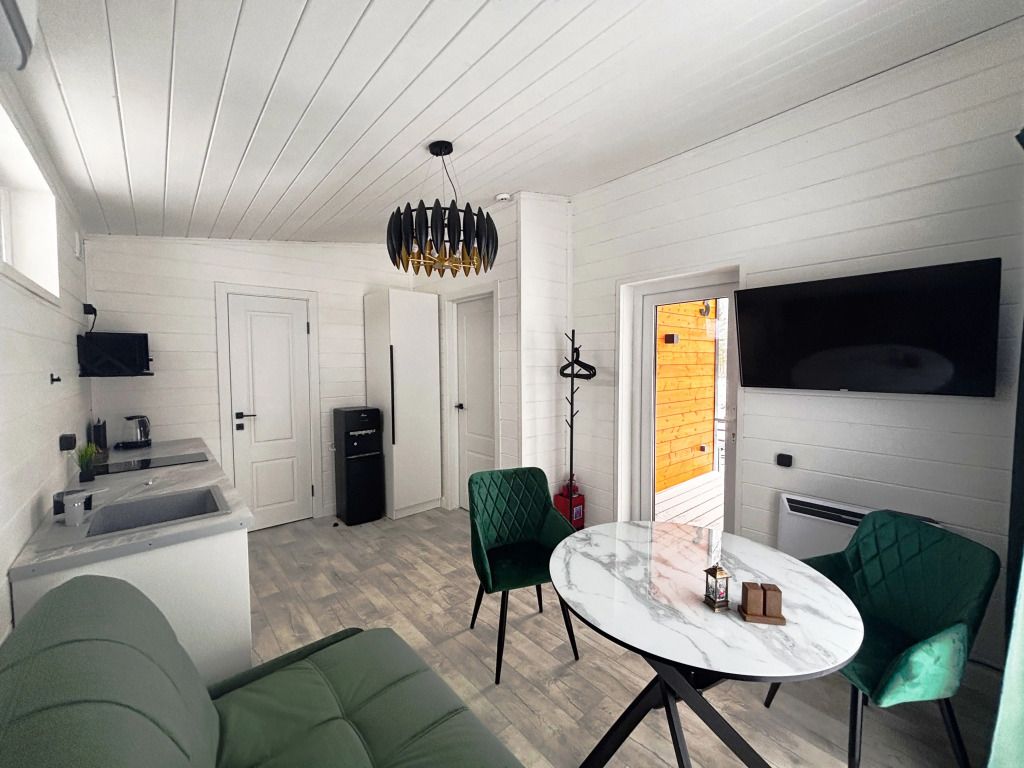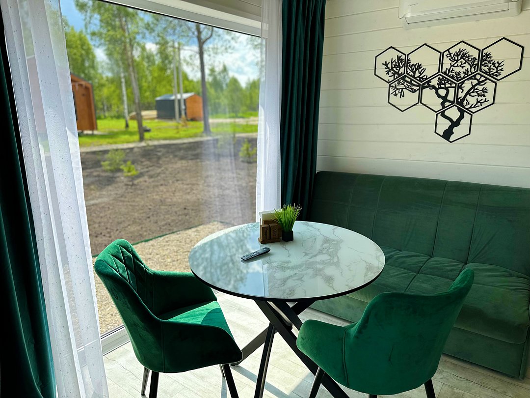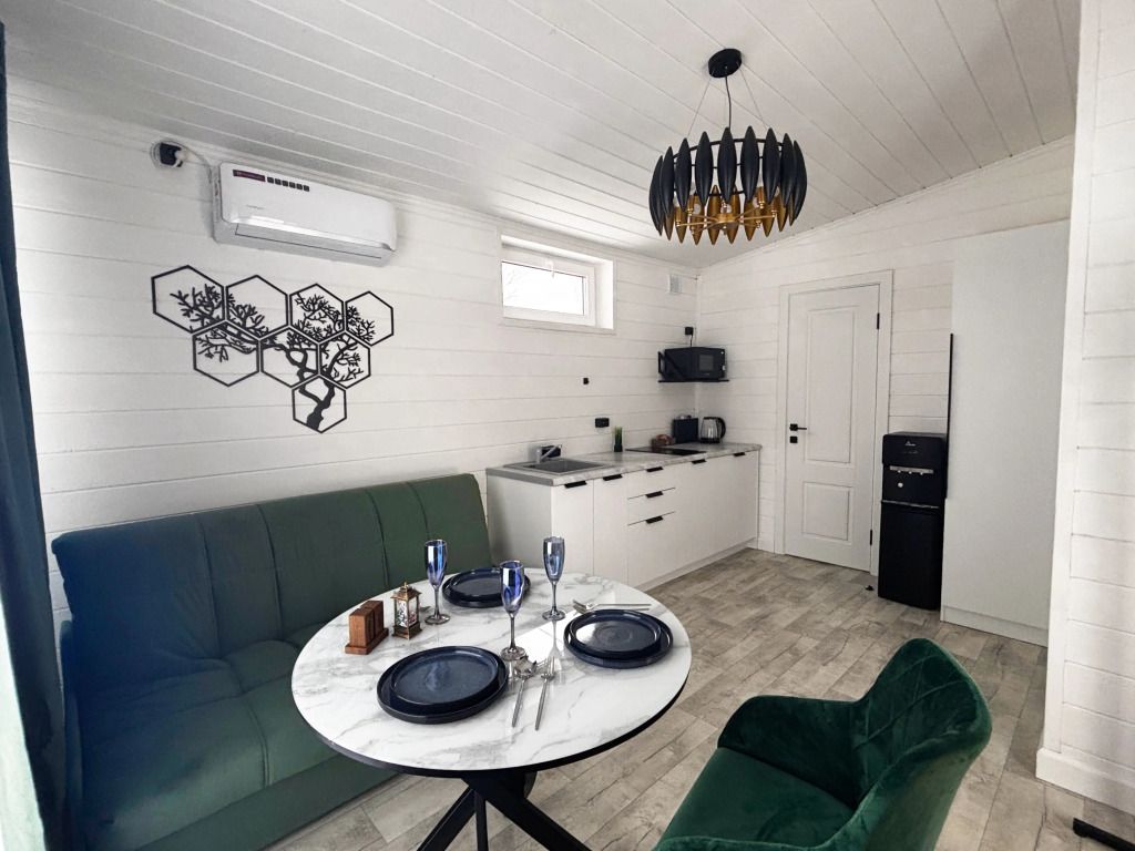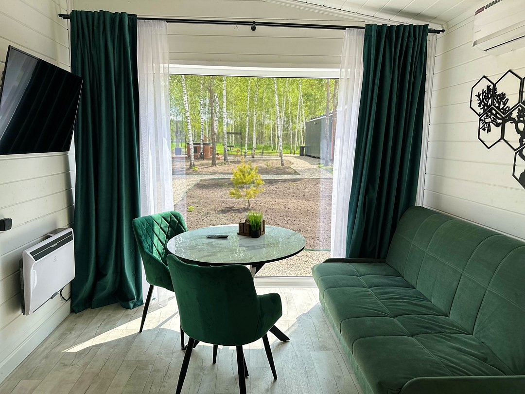 В домике есть отдельная спальня с двухместной кроватью, санузел с душевой кабиной, кухня-гостиная с панорамным окном и раскладным диваном. Интерьер выполнен в белых и зеленых тонах.