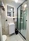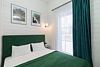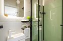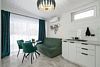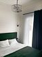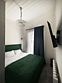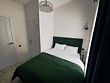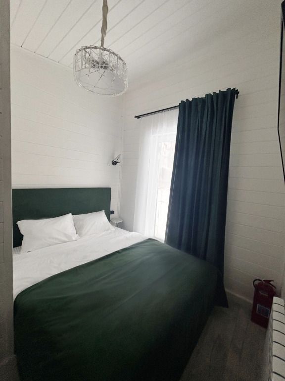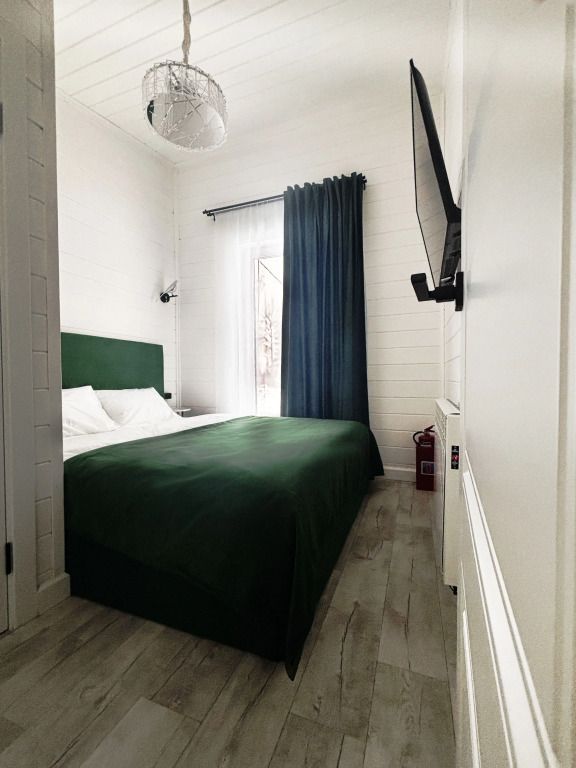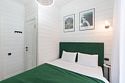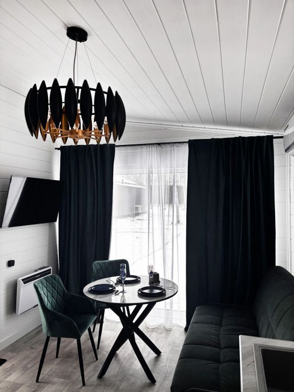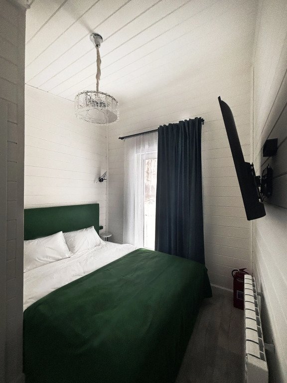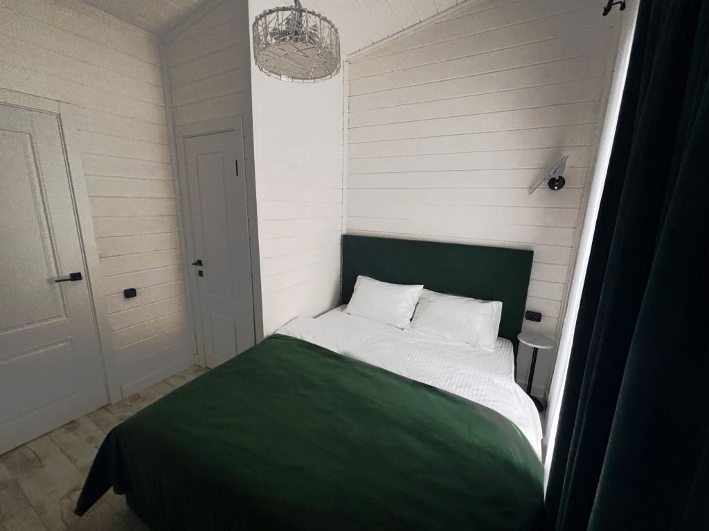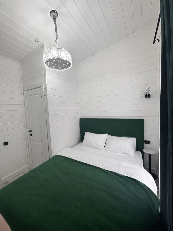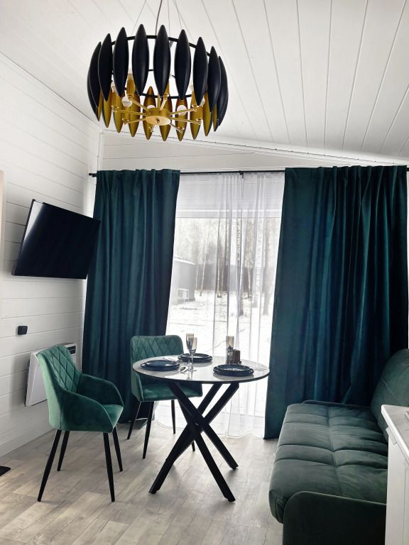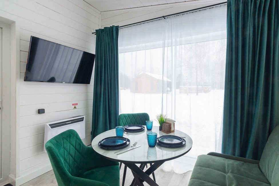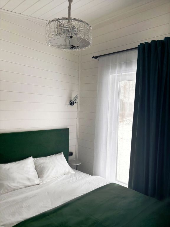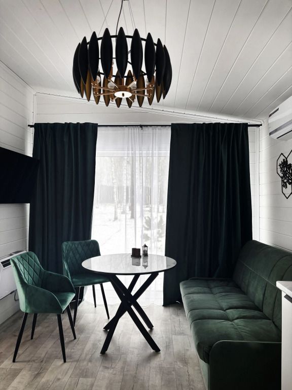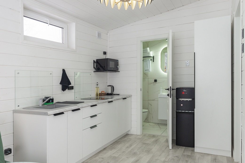 В домике есть отдельная спальня с двухместной кроватью, санузел с душевой кабиной, кухня-гостиная с панорамным окном и раскладным диваном. Интерьер выполнен в белых и зеленых тонах.