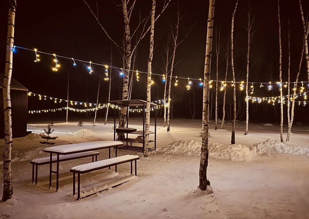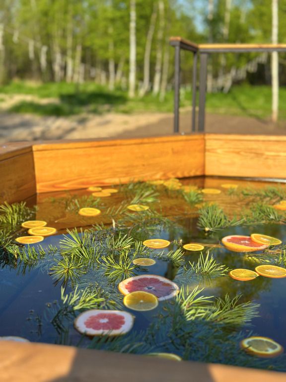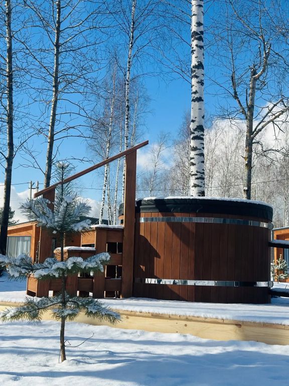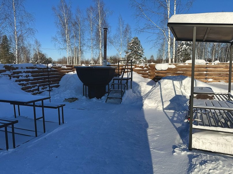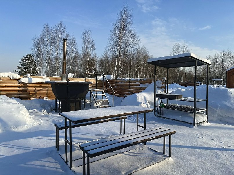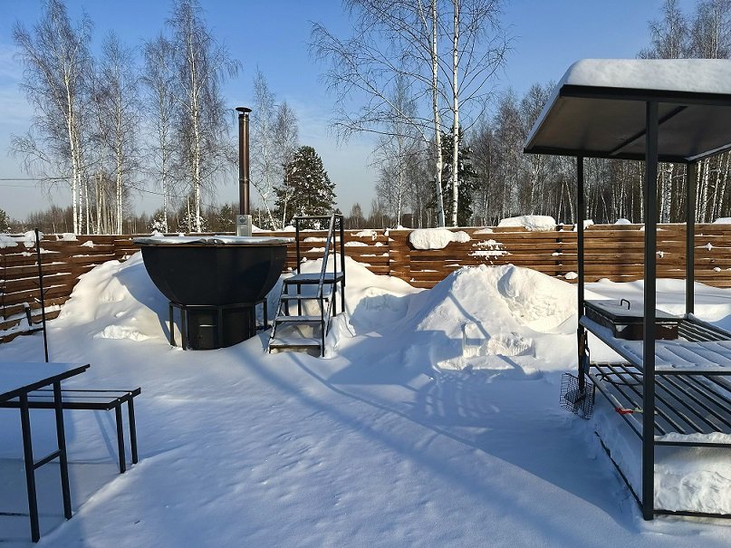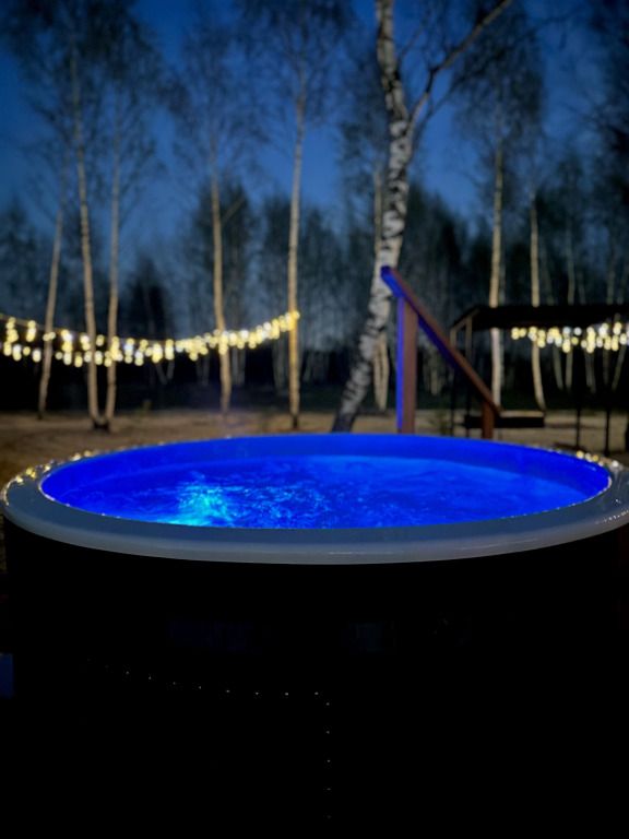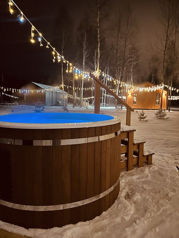 Личная купель или чан около домика под звёздным небом.
