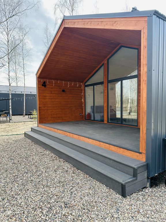 Уютный домик с крытой террасой и видом на лес.