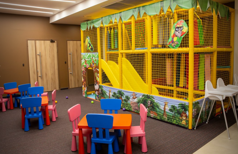 Для самых маленьких гостей курорта на первом этаже физкультурно-оздоровительного комплекса в пиццерии оборудована детская игровая зона. Здесь мальчишки и девчонки могут воспользоваться столиками для игр и рисования (карандаши и раскраски можно спросить у администратора), исследовать лабиринт с препятствиями и даже окунуться в сухой бассейн, наполненный шариками.