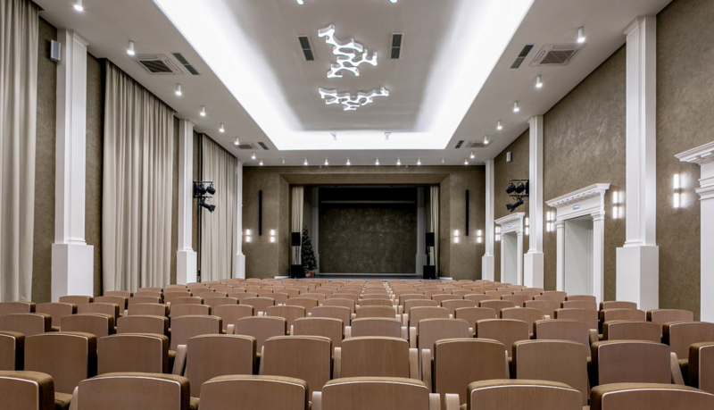 Площадь 360 кв.м, вместимость до 250 человек, зал оборудован экраном, проектором, звуковым и световым оборудованием, стационарной сценой.