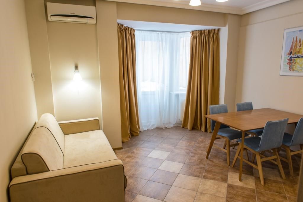 В спальне расположены двуспальная и односпальная кровати. Во второй комнате двуспальный диван, обеденная зона и мини-кухня. В обоих комнатах установлены телевизоры.
