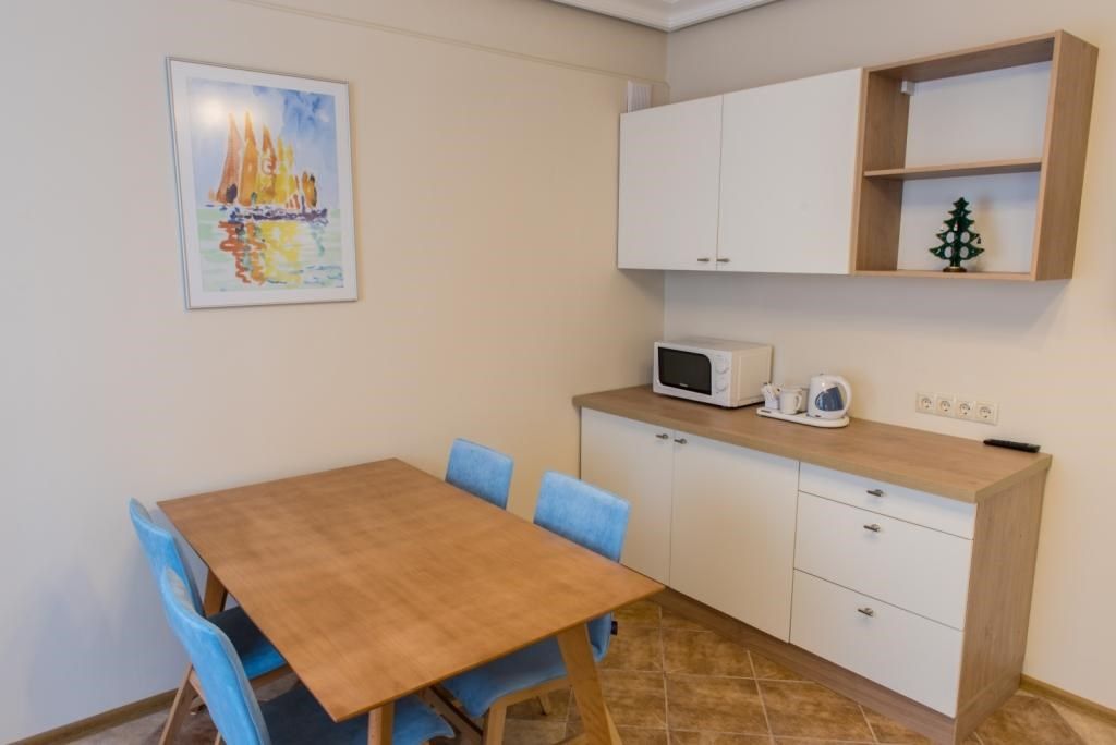 - Встроенная кухня: микроволновая печь, электрический чайник, холодильник.