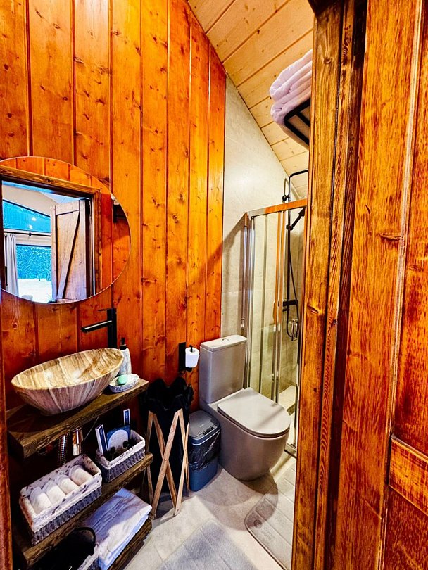 Для проживания гостей предлагаются уютные гостевые домики с панорамными окнами и собственным банным чаном, оснащенные всем необходимым для комфортного проживания. Каждый домик оборудован двуспальной кроватью и раскладным диваном. Из больших окон открывается потрясающий вид на пастбища, где мирно пасутся лошади и олени. Для приготовления блюд на свежем воздухе у каждого дома оборудованы мангальные зоны.